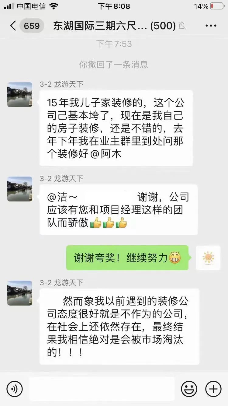 3月14日下午,復(fù)地東湖三期的業(yè)主王先生,往澳華裝飾的業(yè)主服務(wù)群轉(zhuǎn)發(fā)了一條鏈接,并熱情祝賀!原來,澳華裝飾被湖北省市場(chǎng)監(jiān)管局評(píng)為“湖北省放心消費(fèi)創(chuàng)建示范單位”。隨后,業(yè)主王先生又往小區(qū)的500人業(yè)主群轉(zhuǎn)發(fā)了這條消息。