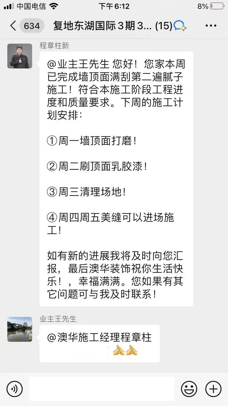 因?yàn)橛羞^一套房子的裝修經(jīng)驗(yàn),業(yè)主王先生自己便是半個(gè)裝修專家,對(duì)設(shè)計(jì)細(xì)節(jié)、施工工藝、材料品質(zhì)、服務(wù)過程有非常嚴(yán)格的要求。為了讓客戶放心,設(shè)計(jì)師及交付團(tuán)隊(duì),實(shí)時(shí)在微信群眾進(jìn)行進(jìn)度播報(bào),讓業(yè)主及時(shí)了解每一項(xiàng)施工過程及細(xì)節(jié)。