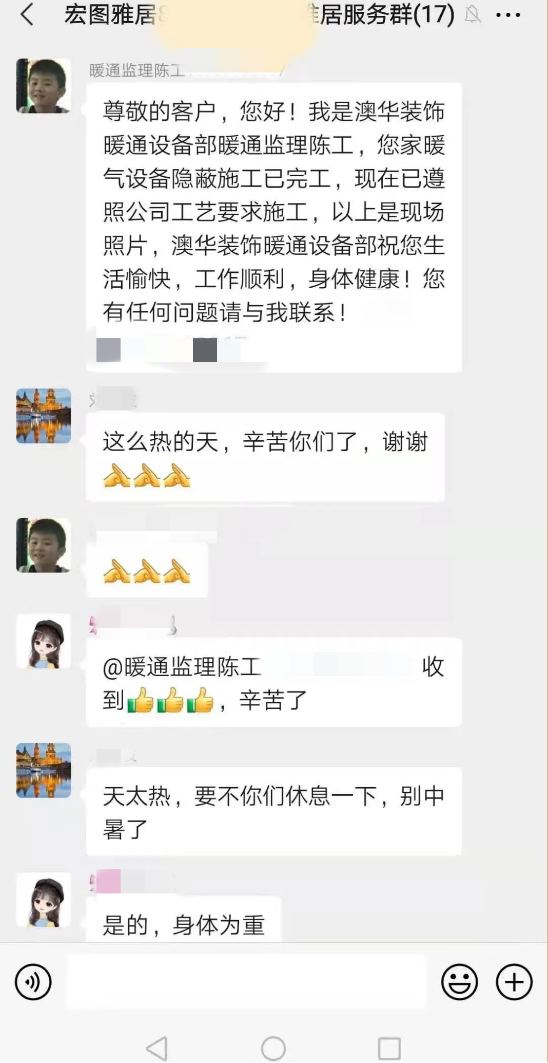 前幾天溫度已達(dá)39℃,業(yè)主親自購買了兩箱礦泉水送到工地,并不時在群里囑咐師傅們多加休息,預(yù)防中暑。