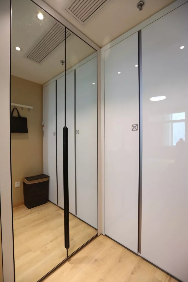 衣帽間應(yīng)以需求習(xí)慣和衣物種類做規(guī)劃配置,如果是獨(dú)立式衣帽間,可采取開放式設(shè)計(jì),不做獨(dú)立門,可安裝嵌入式鏡面衣柜,方便更衣,衣柜內(nèi)增加收納層板,增加收納量還能避免開放式層板可能造成的凌亂感。
