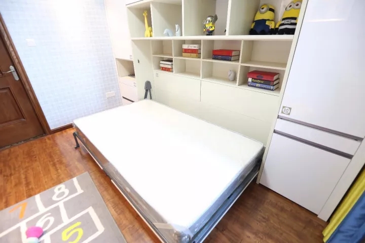 臥室的方寸空間,最重要的是合理利用每個區(qū)域,除了固定空間之外,還可利用衣柜和床板。衣柜中間做儲物格,分離長短衣的同時,格子同時起到了裝飾作用。兒童房可以使用翻板床,白天可以給小朋友留出一個自娛自樂的小天地,晚上拉下成床。