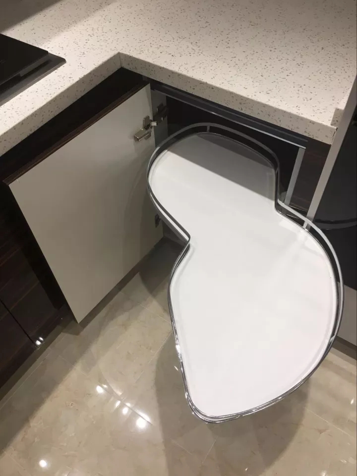 碗碟拉籃的升級版,轉(zhuǎn)角柜拉籃,飛碟型拉籃可以旋轉(zhuǎn)拉出,完全利用了廚房的狹小空間,做到了收納極致。
