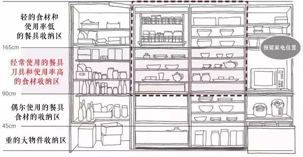 櫥柜中要預(yù)留電器的擺放位置,可以按照使用頻率來擺放。