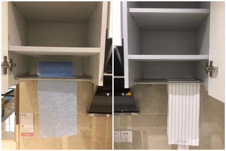 吊柜下方無托板,用帶掛鉤格柵替代,左邊放置吸油紙,右邊可以放置濕抹布,關(guān)上柜門,直接拉取使用,美觀又實用。