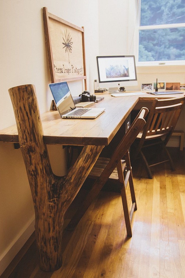 相比較長(zhǎng)條形而言,在中間夾角區(qū)域增設(shè)木板,增大臺(tái)面面積,緩解了不能伸腿的尷尬。兩側(cè)分別擱置儲(chǔ)物柜,顯得整潔、干凈,又有效填充了底部區(qū)域,看起來(lái)不會(huì)顯得過(guò)于空洞。