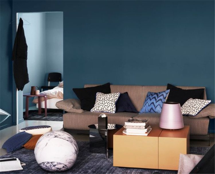 以靜謐的深藍(lán)色為主色調(diào)的空間中,利用軟裝的合理搭配成功擺脫壓抑與局促感,為空間增添一絲活力?,F(xiàn)代感十足的金棕色茶幾搭配深色調(diào)的抱枕,實(shí)現(xiàn)精準(zhǔn)色彩配比。