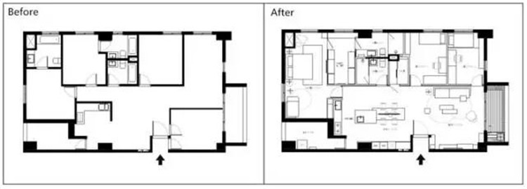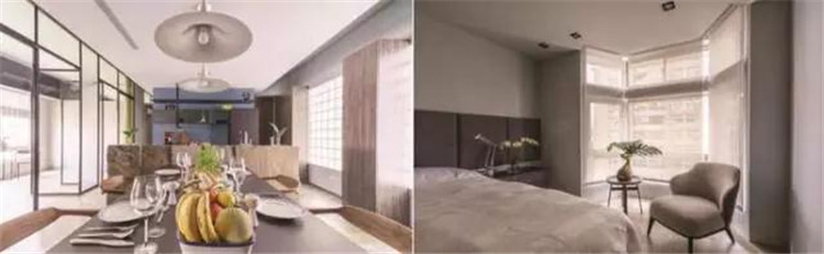 下圖戶型案例:改變有畸零角落與封閉性的格局。在打掉廚房和右側(cè)房的圍墻后,一入門就是寬敞的開放式客餐廚,并把房間和衛(wèi)浴都集中在同側(cè),將各個(gè)房間的門隱藏于后, 而主臥則以通透的玻璃材質(zhì),讓每一個(gè)隔間的窗光灑入。