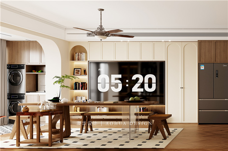 摒棄傳統(tǒng)客廳設計,在客廳定制滿墻書柜,拱形門與開放格組合,兼顧功能性與美觀性。