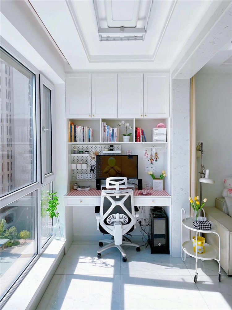 想要陽臺成為“專業(yè)”的讀書區(qū),可考慮在陽臺一側(cè)或兩側(cè)設置書柜,將你喜歡的書都搬到這里,然后搭配一張舒適的休閑椅或是榻榻米,一個專屬于你的“讀書區(qū)”就能形成。