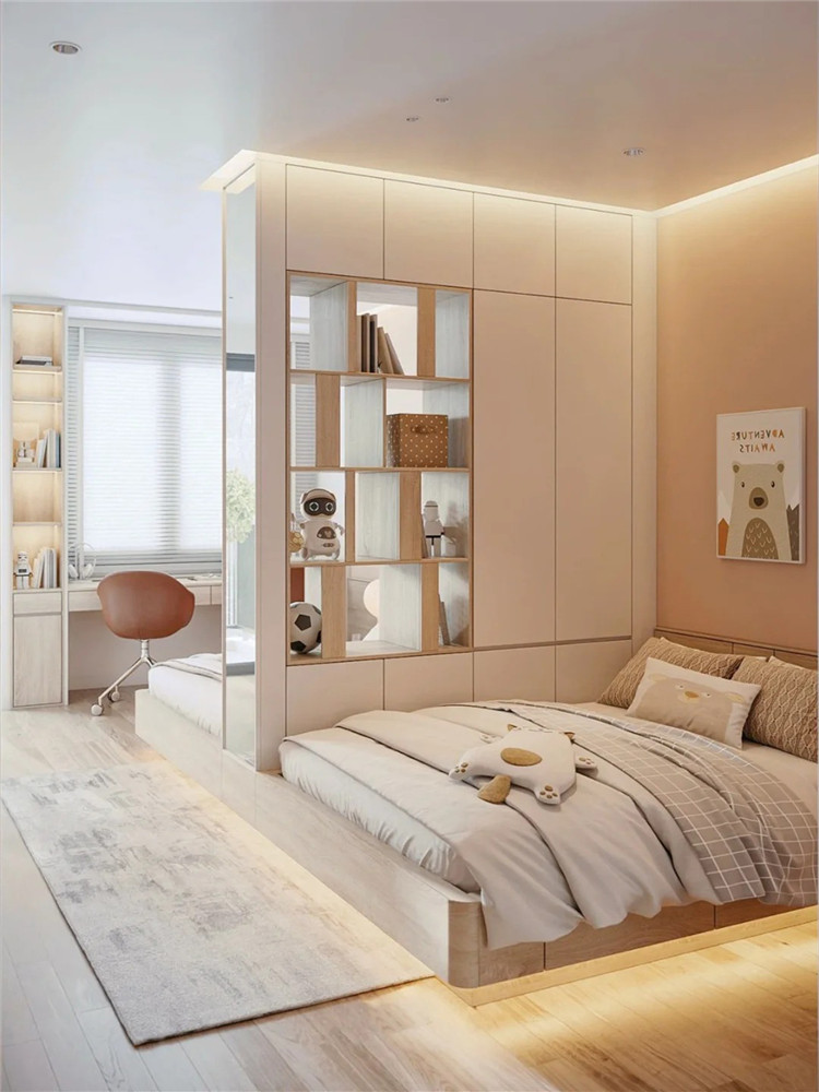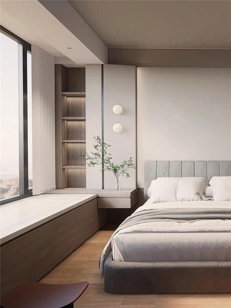 當然,飄窗能拆除的情況下,可于此定制懸浮書桌與書柜,不僅實用性更強,視覺上也更美觀。