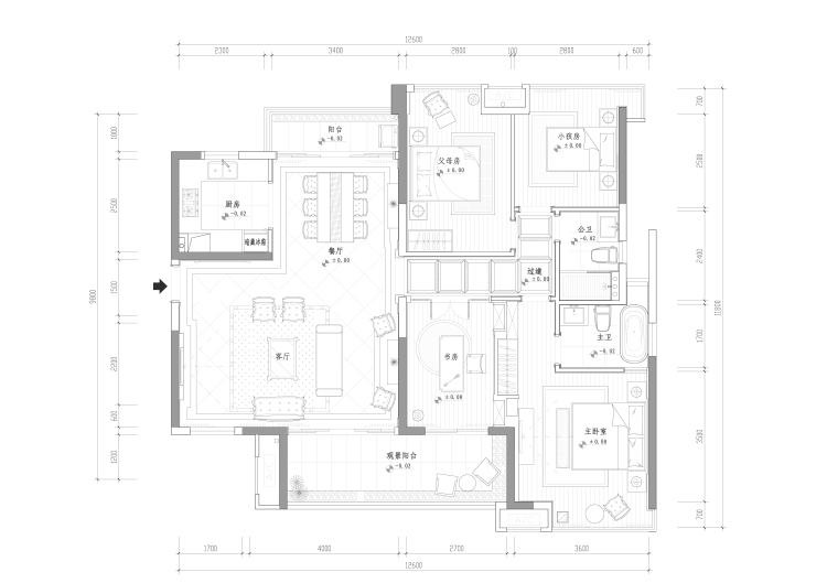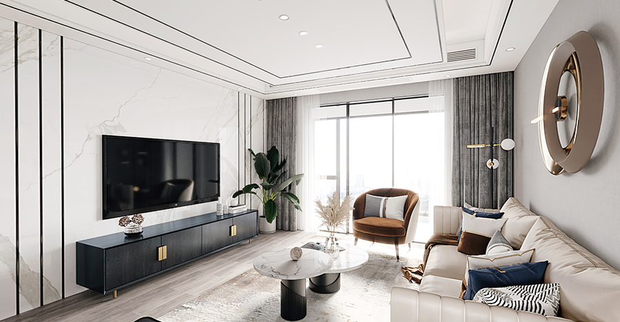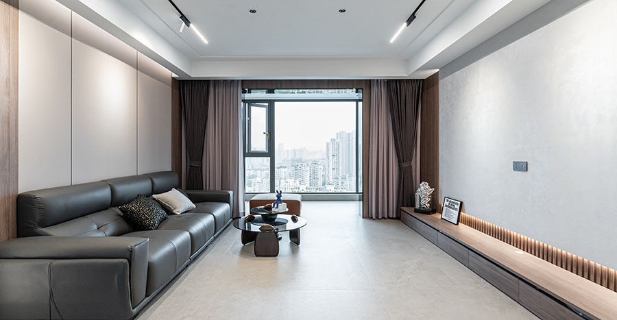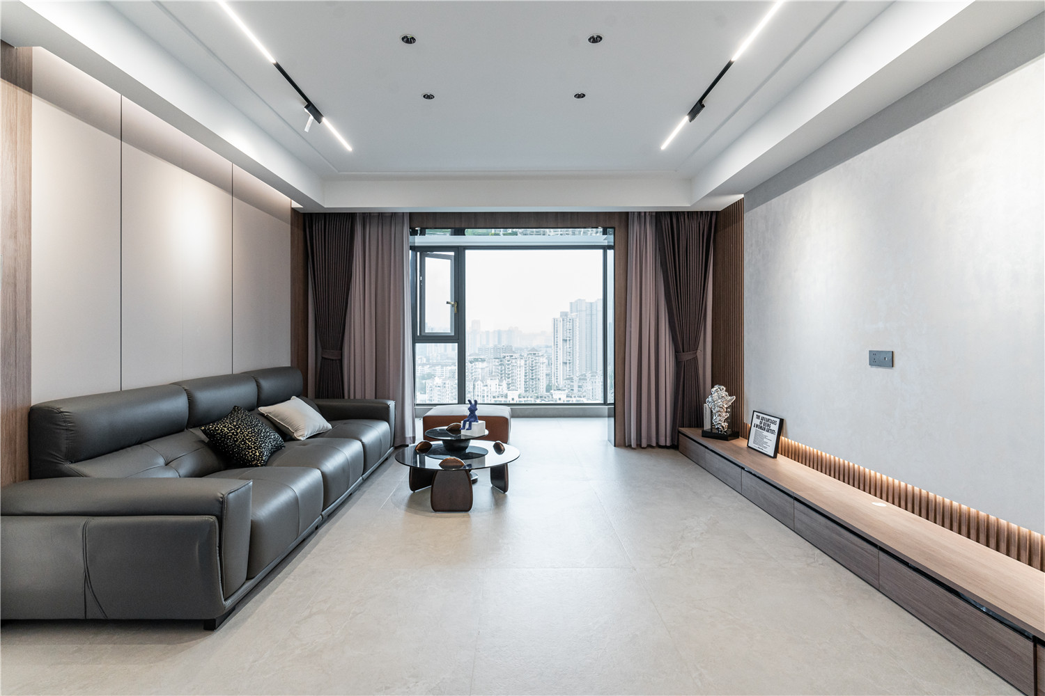 這是橡樹灣中一套160㎡的四居室,戶型面積中等,采光條件好,但內(nèi)部分區(qū)較多,休憩區(qū)分區(qū)雜亂,需要設(shè)計出有邏輯的行動走線,這樣整體空間才具有設(shè)計感和時尚感。將餐廳與客廳中的非承重墻拆除,將兩個功能區(qū)合二為一,擴(kuò)大了公共區(qū)域面積,使日常走動更為方便,以過道為中心,南北各分布兩個休憩區(qū),日常生活變得更為舒適。