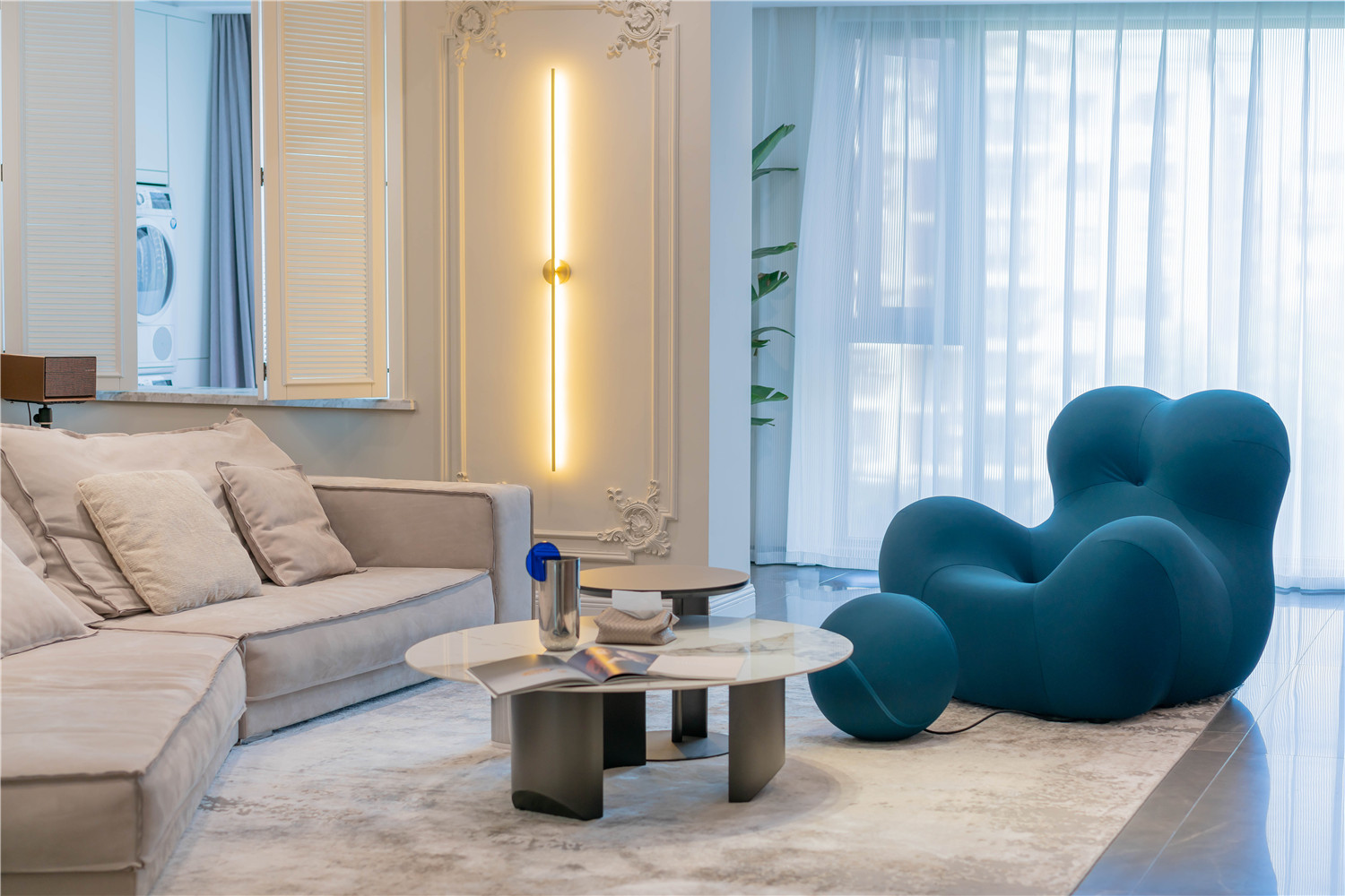 客廳以咖色系為主基調(diào),浪漫的配色帶有女王氣質(zhì),簡(jiǎn)約的線條中不失輕奢韻味;背景墻一面設(shè)計(jì)為書柜,一面設(shè)計(jì)為辦公空間,別有一番風(fēng)味;灰色絨質(zhì)沙發(fā)與橘色單椅圍合式放置,空間更具設(shè)計(jì)感,雕塑、擺件、燈具等元素,都令客廳帶有復(fù)古的氣息。