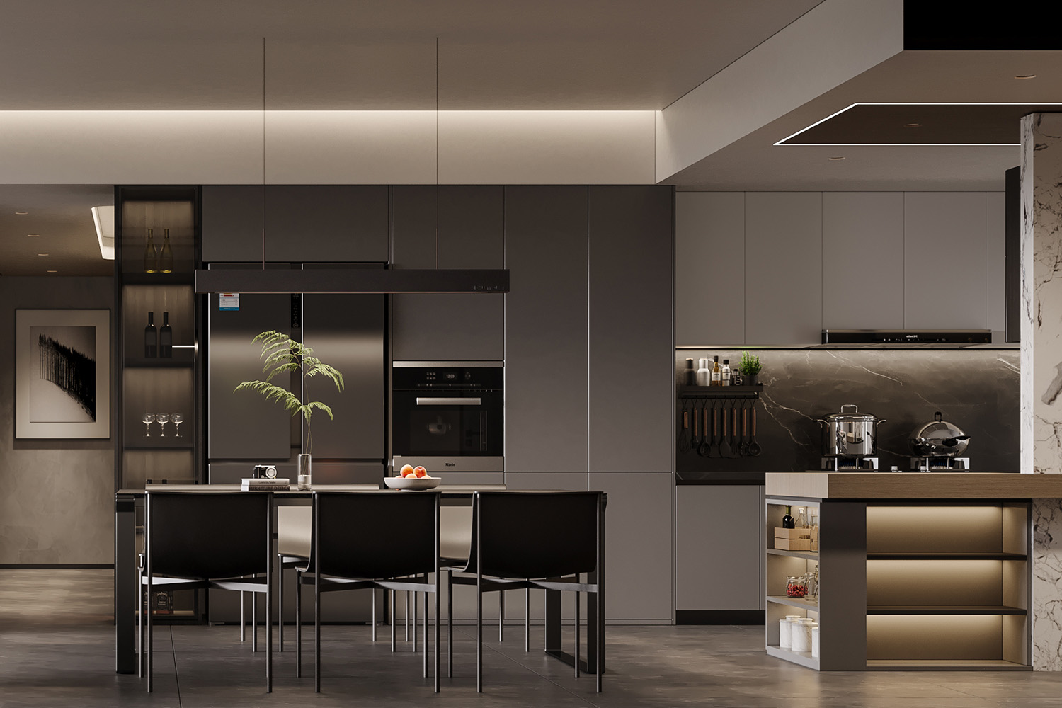 打造餐廳的精致感不需要太過復(fù)雜的裝飾,餐邊柜以收納功能為主,添置燈帶裝飾,即可呈現(xiàn)出時(shí)尚氛圍,餐桌椅的造型盡量時(shí)尚一些,搭配水晶燈具,足以展現(xiàn)出大方氣質(zhì)。