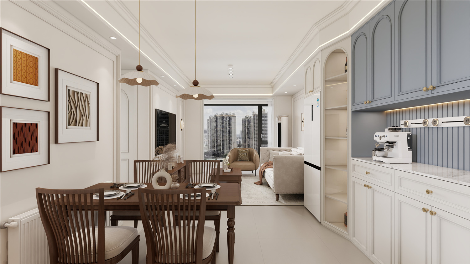 就餐區(qū)域設(shè)置在拐角處,同時(shí)借助簡單的餐桌椅與吊燈完成軟裝,強(qiáng)調(diào)實(shí)用性。