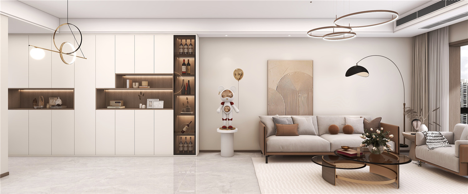 客廳整體用色素雅潔凈,強(qiáng)調(diào)柔和溫馨感。大面積的落地窗則確保陽光能夠更好的進(jìn)入會(huì)客區(qū)域,提升生活品質(zhì)。