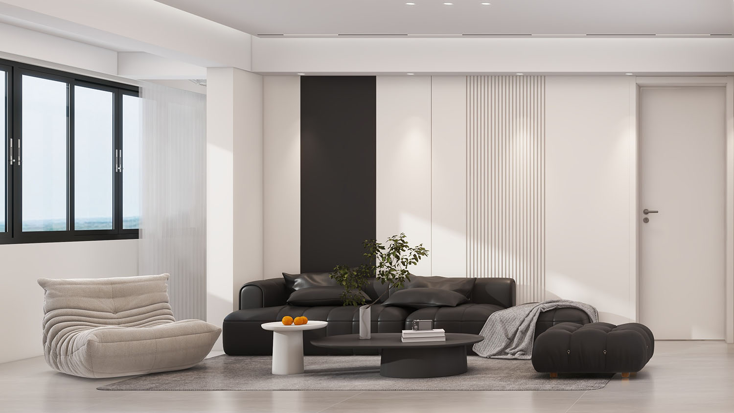 過多的白色或許會顯得單調(diào),但擺放一款線條圓潤的黑色沙發(fā),不僅引領(lǐng)視覺下沉,還融入了靜謐與安寧的氛圍。一旁蓬勃生長的植物,更為空間增添了一抹清新與生機。