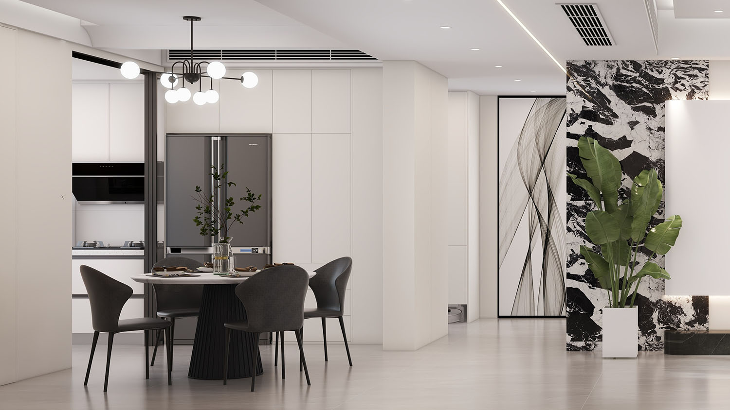 2、整合餐廳、陽臺與廚房,新布局容納中西廚、儲物空間,并與餐廳融合,實現(xiàn)多功能一體化。