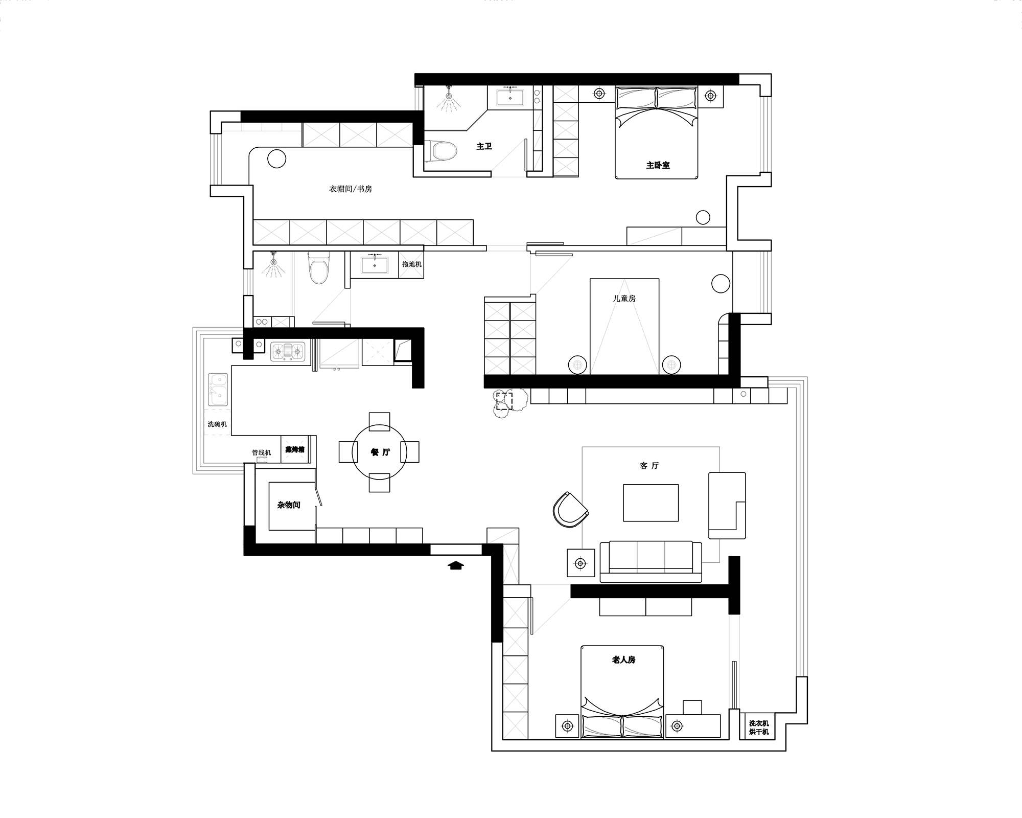 ③承重墻不動,兩側(cè)定制衣柜餐邊柜,增強收納并巧妙遮擋承重柱,美化空間。