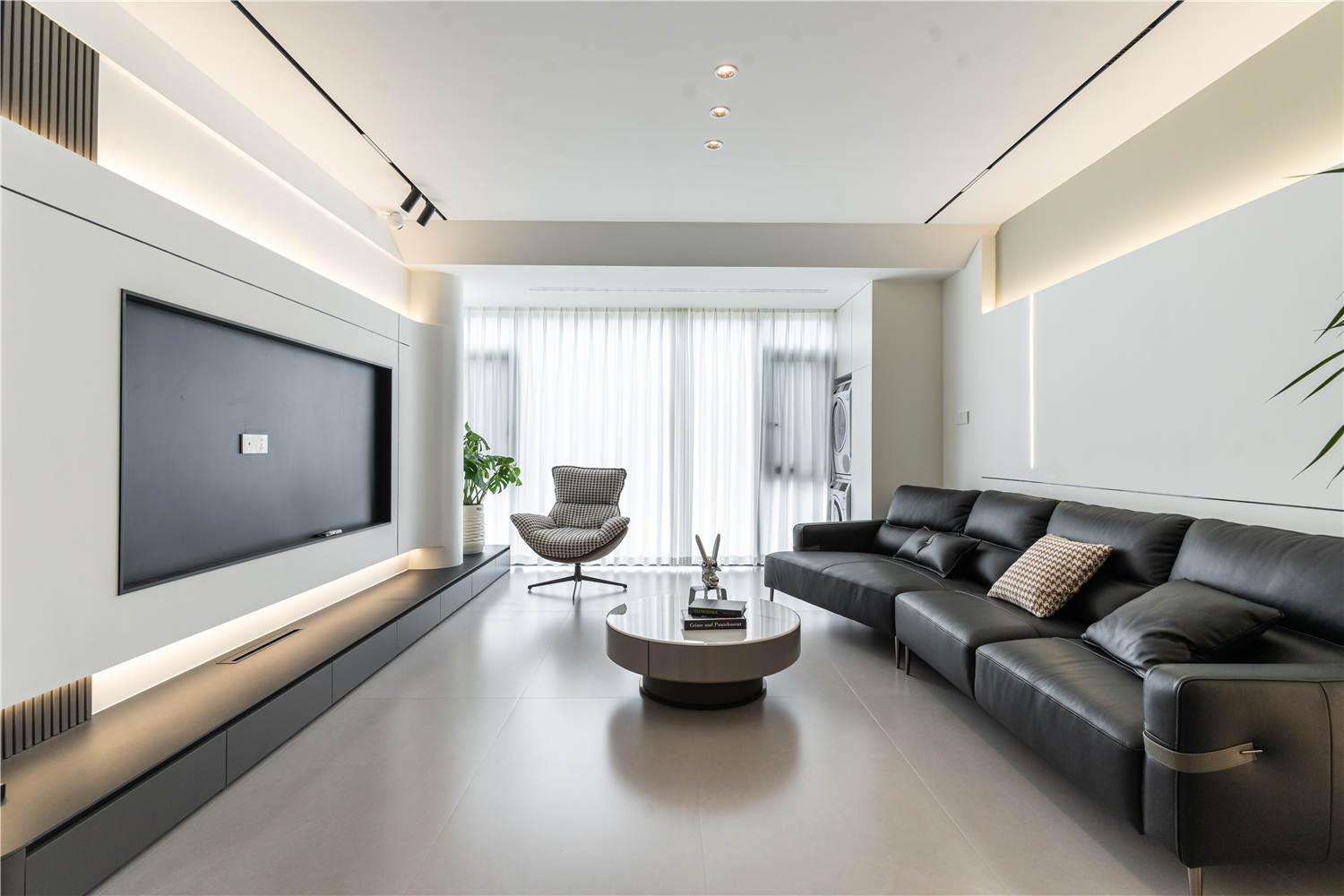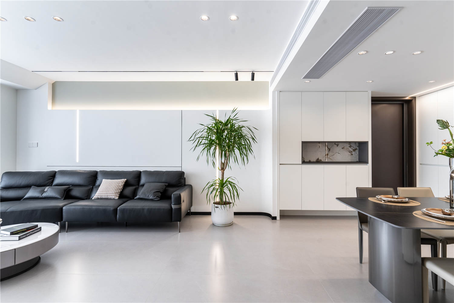 在黑白灰的主色調(diào)下,客廳彌漫著一股純粹而高雅的氣息,這種色調(diào)憑借其強大的包容性和可塑性,勾勒出了一幅和諧而宜居的生活畫卷。