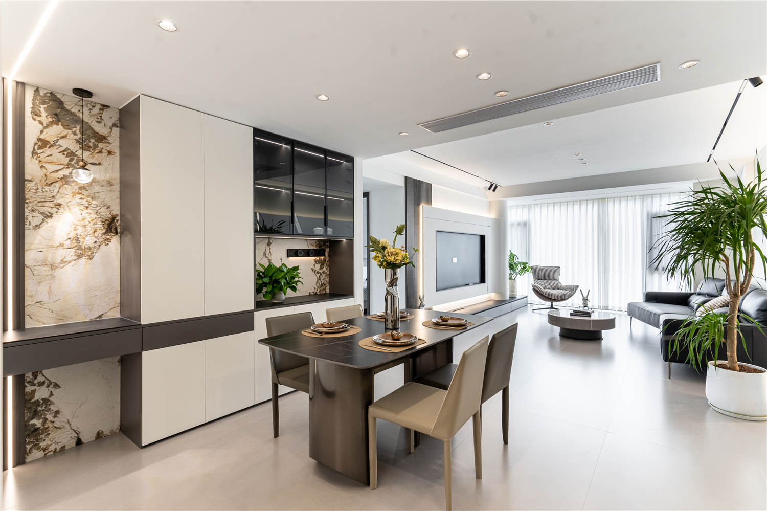 筆直的線性燈則如同精致的紐帶,將陽臺、客廳與餐廳三個空間無縫串聯(lián),營造出連貫而和諧的視覺體驗。