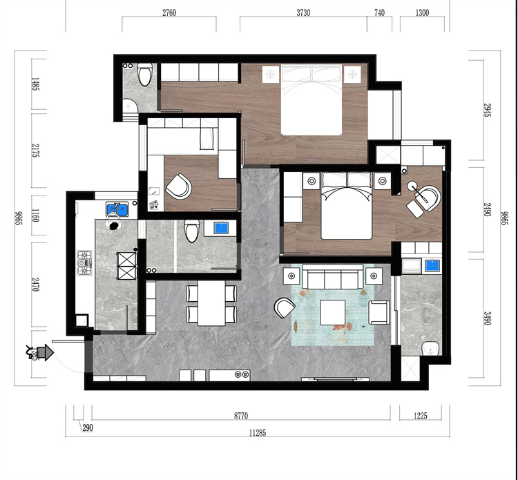 南湖壹號這套118㎡的三居室住宅整體結(jié)構(gòu)相對還算比較規(guī)整,但是原有的戶型結(jié)構(gòu)并沒有進行功能分區(qū),因此設(shè)計師需要結(jié)合業(yè)主與家人的使用需求、生活習(xí)慣以及空間的結(jié)構(gòu)特點進行功能分區(qū)。為了降低室內(nèi)油煙感,設(shè)計師將與外部銜接的小空間設(shè)計為廚房,以避免油煙進入生活空間。主臥區(qū)域則將旁邊的墻面直接打通進行空間擴大,同時融入衣帽間設(shè)計與衛(wèi)浴設(shè)計,提升主人的生活品質(zhì)。