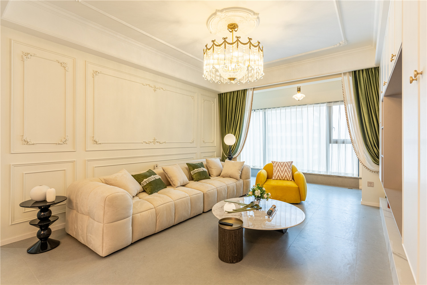 大面積的白色背景墻搭配上細節(jié)處的線條浮雕處理,低調(diào)耐看而又歐亞。亮色沙發(fā)則為空間增添跳躍趣味感。