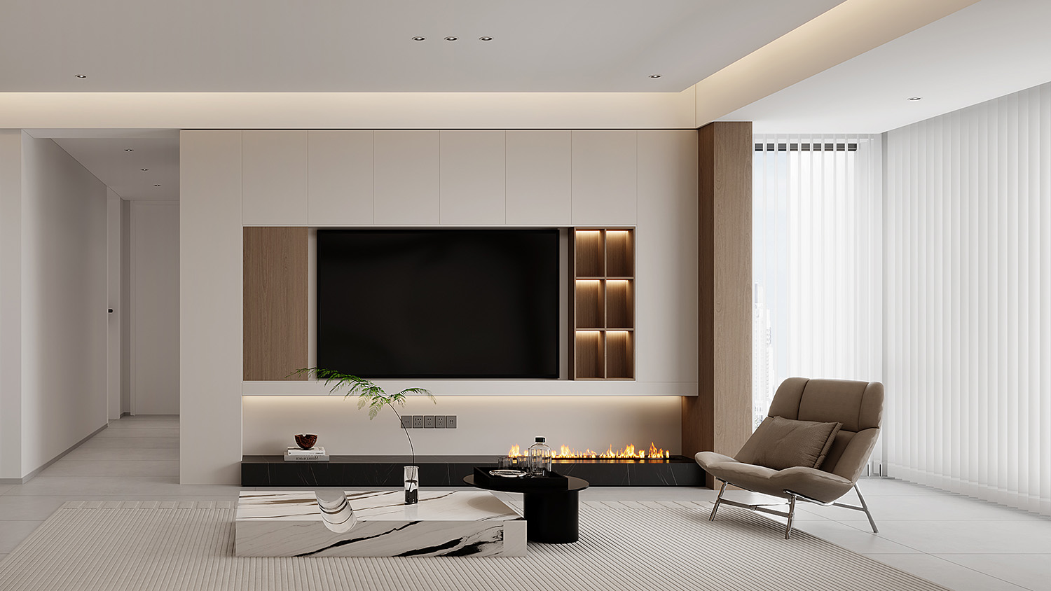 由山水畫構(gòu)成的電視背景墻典雅又清新,帶有簡單線條處理的灰色地毯則為空間增添時尚摩登氛圍。
