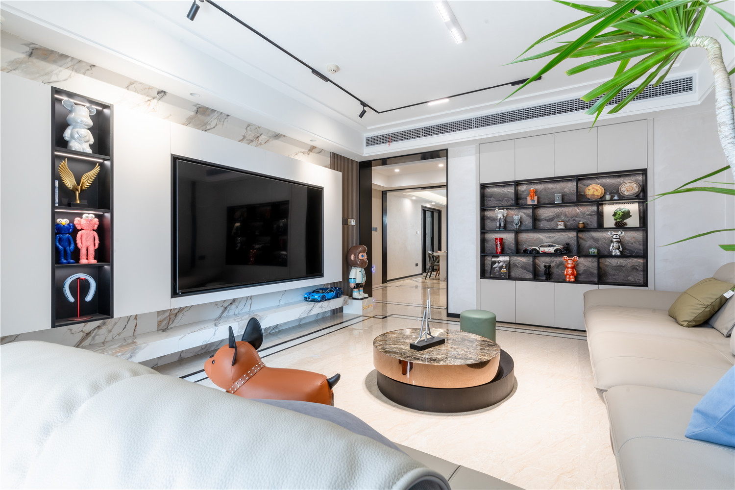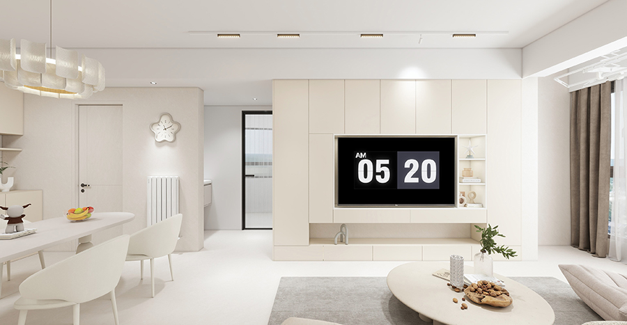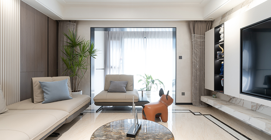 客廳采用新中式天花設計,在線條的勾勒下及中式燈具的點綴下,進一步擴大了客廳的通透感;沙發(fā)部分依業(yè)主需求,使用了現(xiàn)代白色沙發(fā),搭配木質(zhì)茶幾、電視地柜及新中式軟裝,令空間顯得更加輕盈。