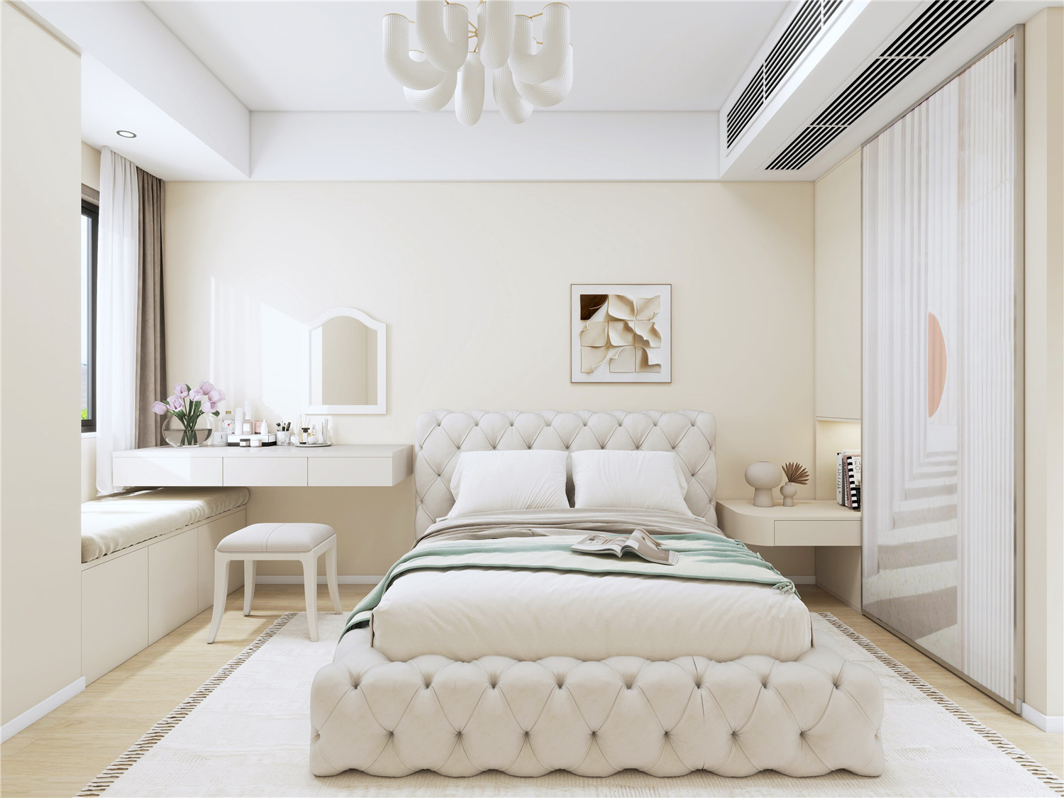 臥室空間需強調(diào)寧靜的氛圍感,因此設計師在對臥室區(qū)域進行設計的時候使用了光線相對比較柔和的燈具,以強調(diào)靜謐感。而床頭處的簡約藝術(shù)掛件則讓整個臥室空間多了一抹自然的氣息美。