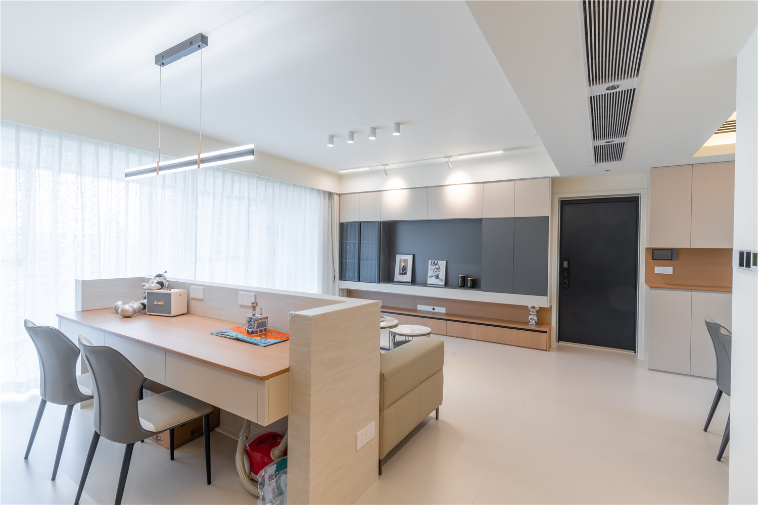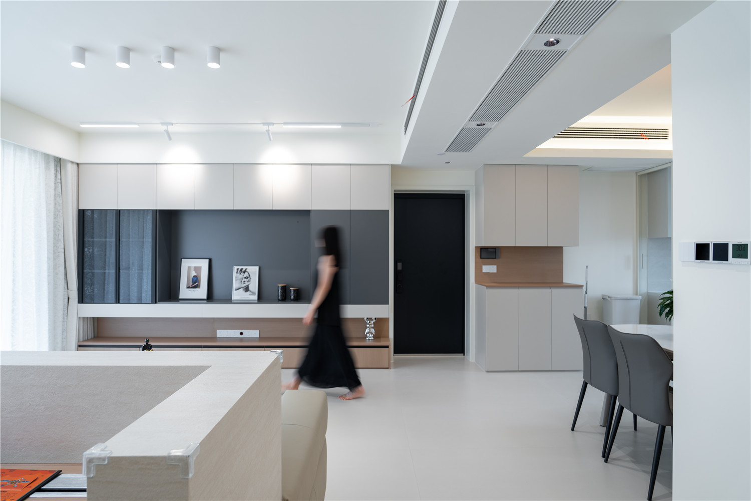 為緩解進門見廳的尷尬局面,玄關(guān)處設計了實體半隔斷,掛畫裝飾后觀感非常棒;玄關(guān)柜采用嵌入式設計,立面干凈,為玄關(guān)空間贏出更多活動空間。