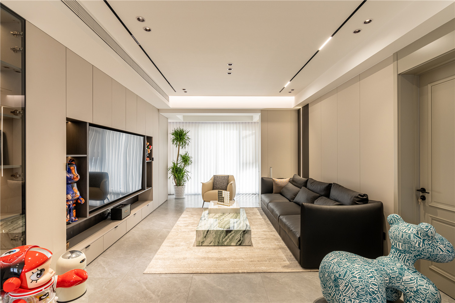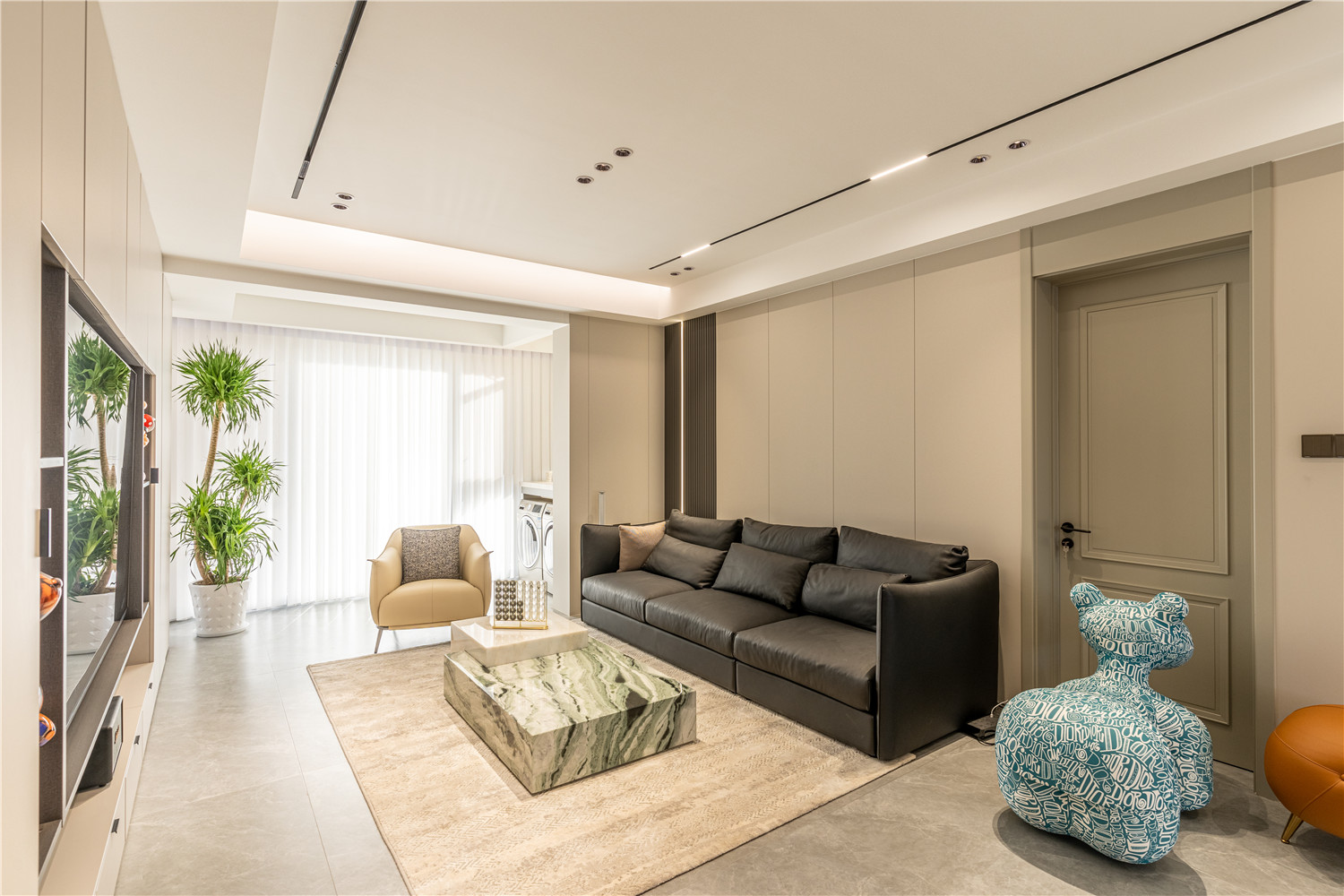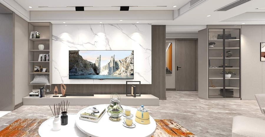 大面積的大理石瓷磚奠定了清冷通透的空間氛圍,搭配以質(zhì)感溫潤的木材,有效提升了空間的視覺平衡感。