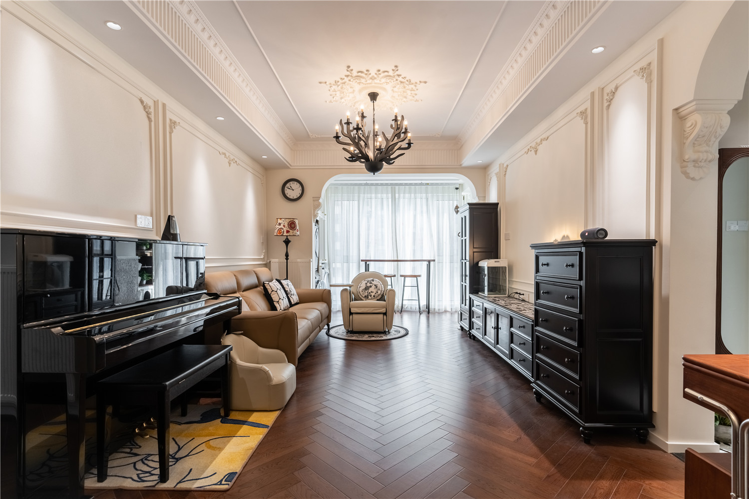 軍運(yùn)村這套300㎡的復(fù)式別墅空間十分寬敞,且南北通透,帶有南向大陽臺,整體戶型優(yōu)勢較為明顯。因此設(shè)計師在進(jìn)行規(guī)劃設(shè)計的時候,充分利用了空間的優(yōu)勢,借助各種大面積窗戶的設(shè)計,提升室內(nèi)采光。為了擴(kuò)大陽臺空間,提升家居品質(zhì),設(shè)計師將客廳的陽臺與臥室陽臺直接打通,將整個陽臺空間改造成視角極佳的觀賞區(qū),便于業(yè)主與家人觀賞室外美景。