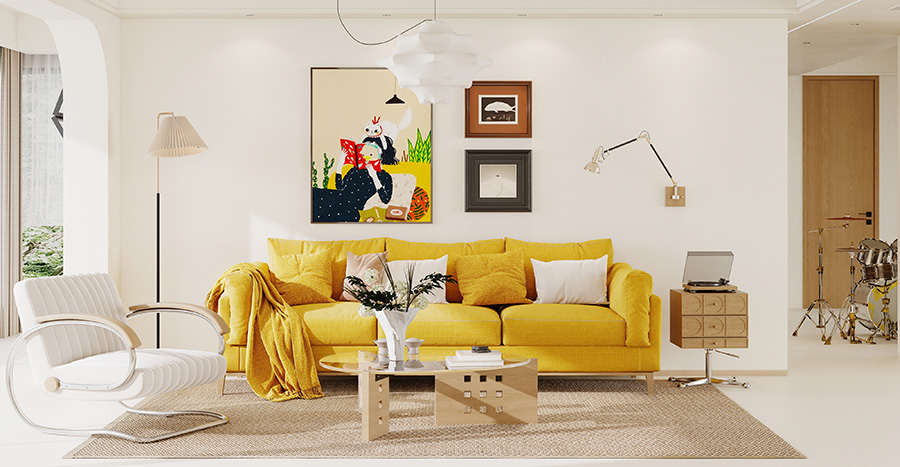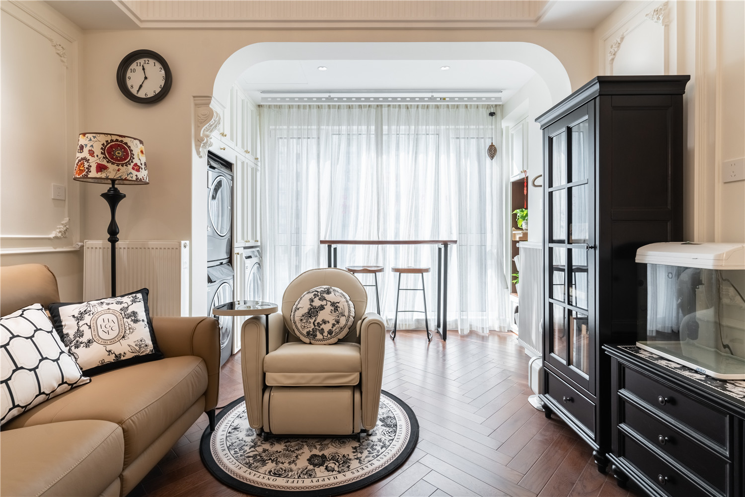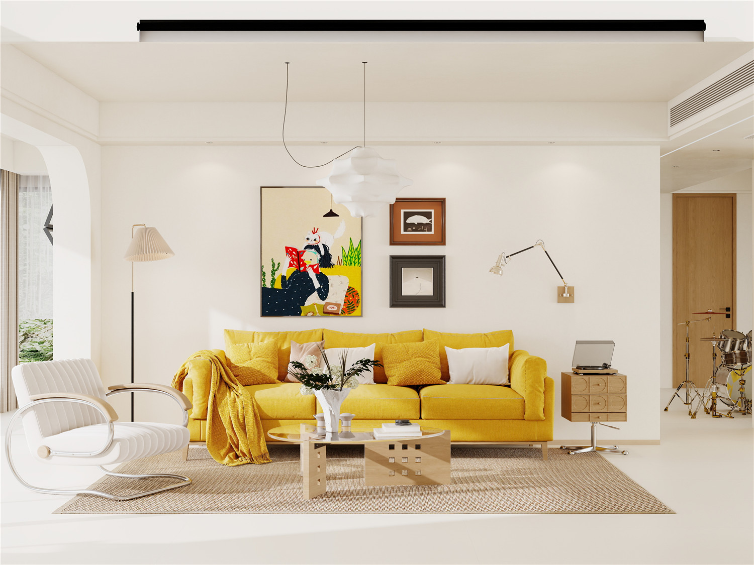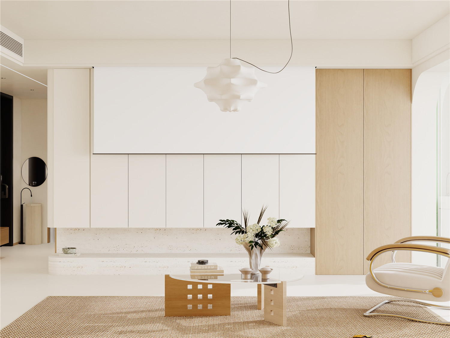 客廳區(qū)域借助莫蘭迪色系進(jìn)行裝飾,強(qiáng)調(diào)一種朦朧的優(yōu)雅氛圍。