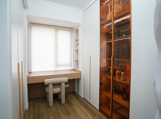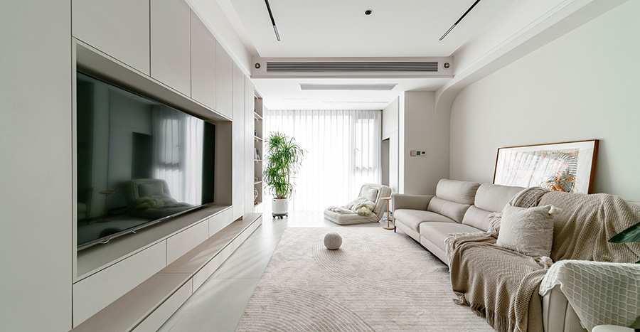 為了提升主臥區(qū)域的靜謐感,設(shè)計(jì)時(shí)使用了相對(duì)比較柔和的灰白配色,同時(shí)借助柔軟的地毯與溫潤(rùn)感十足的木質(zhì)地板來(lái)營(yíng)造休憩空間的溫馨柔和氛圍。