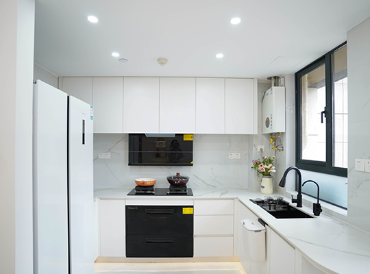 白色櫥柜搭配上原色色地板,兩種素色之間的組合清新而又不失結(jié)構(gòu)美。