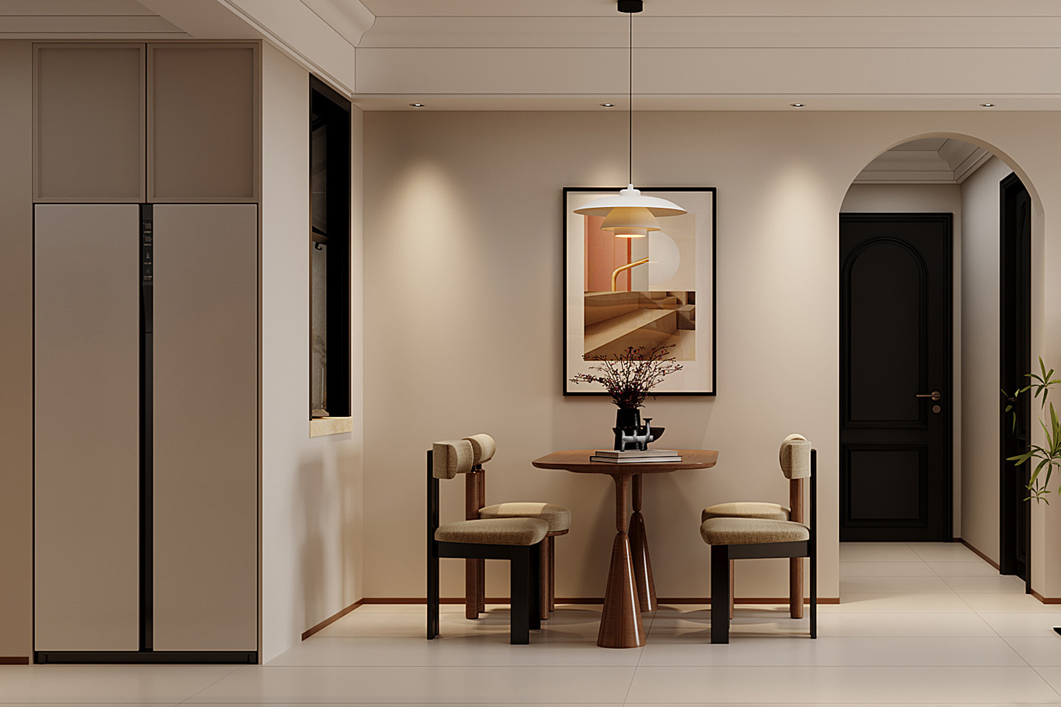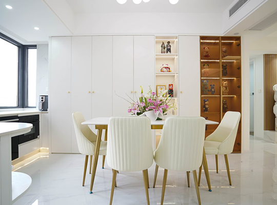 嵌入式雙開大冰箱存在感不強(qiáng)且能夠滿足日常使用需求,長(zhǎng)條形淺色餐桌耐看且能夠滿足多位家庭成員的就餐需求。