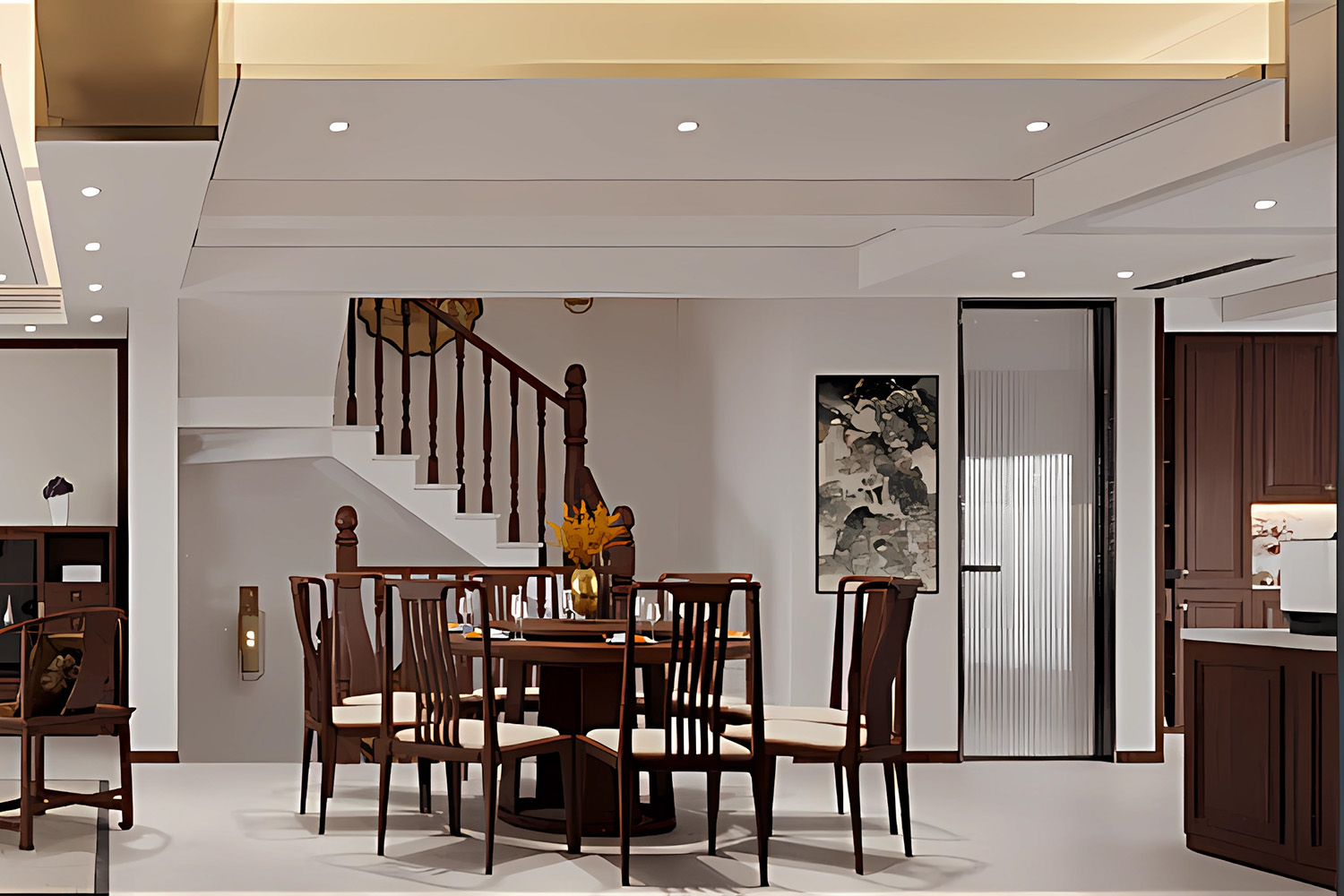 就餐區(qū)域被設(shè)置在一樓,借助大理石臺(tái)面打造餐桌,簡(jiǎn)約而又不失輕奢高級(jí)感。