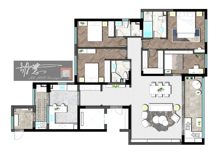 西北湖一號這套四居室的占地面積約為199㎡,戶型結構并不規(guī)整,尤其是入戶區(qū)域的空間過多,因此設計師將入戶區(qū)域進行改造,借助戶型本身自帶的拐角進行視覺裝飾,提升室內(nèi)隱私感,同時借用一些色彩、圖案裝飾,提升玄關區(qū)域的視覺美感感。為了業(yè)主業(yè)主及家庭人員的起居使用需求,空間中共規(guī)劃了三個衛(wèi)浴區(qū)域,其中主臥帶一個,保姆房帶一個,提升空間私密性,而另外一個則作用共用洗浴空間,滿足客人的使用需求。