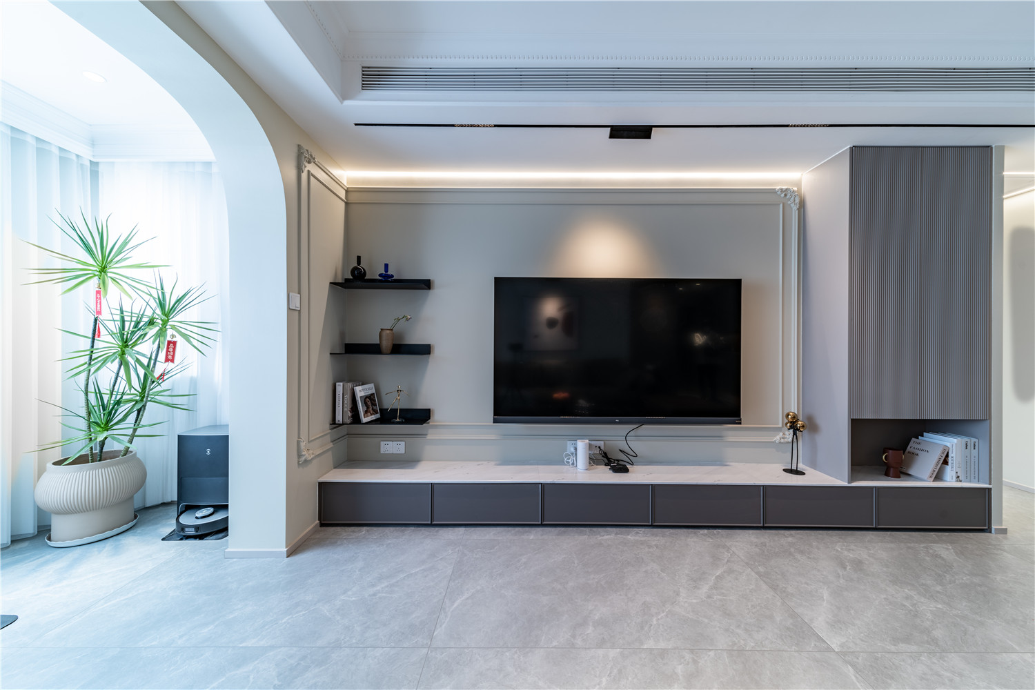嵌入式的電視機背景墻設計有效提升空間的現(xiàn)代時尚氣息,淺灰色的背景搭配上直線條則給人沉穩(wěn)大氣的清新質(zhì)感。