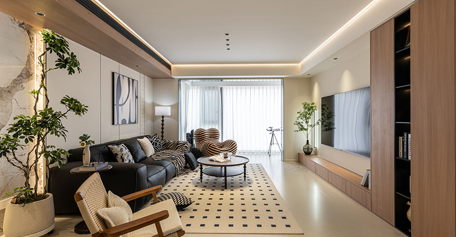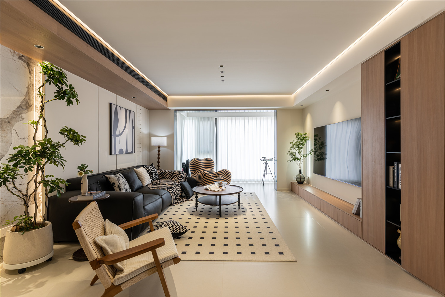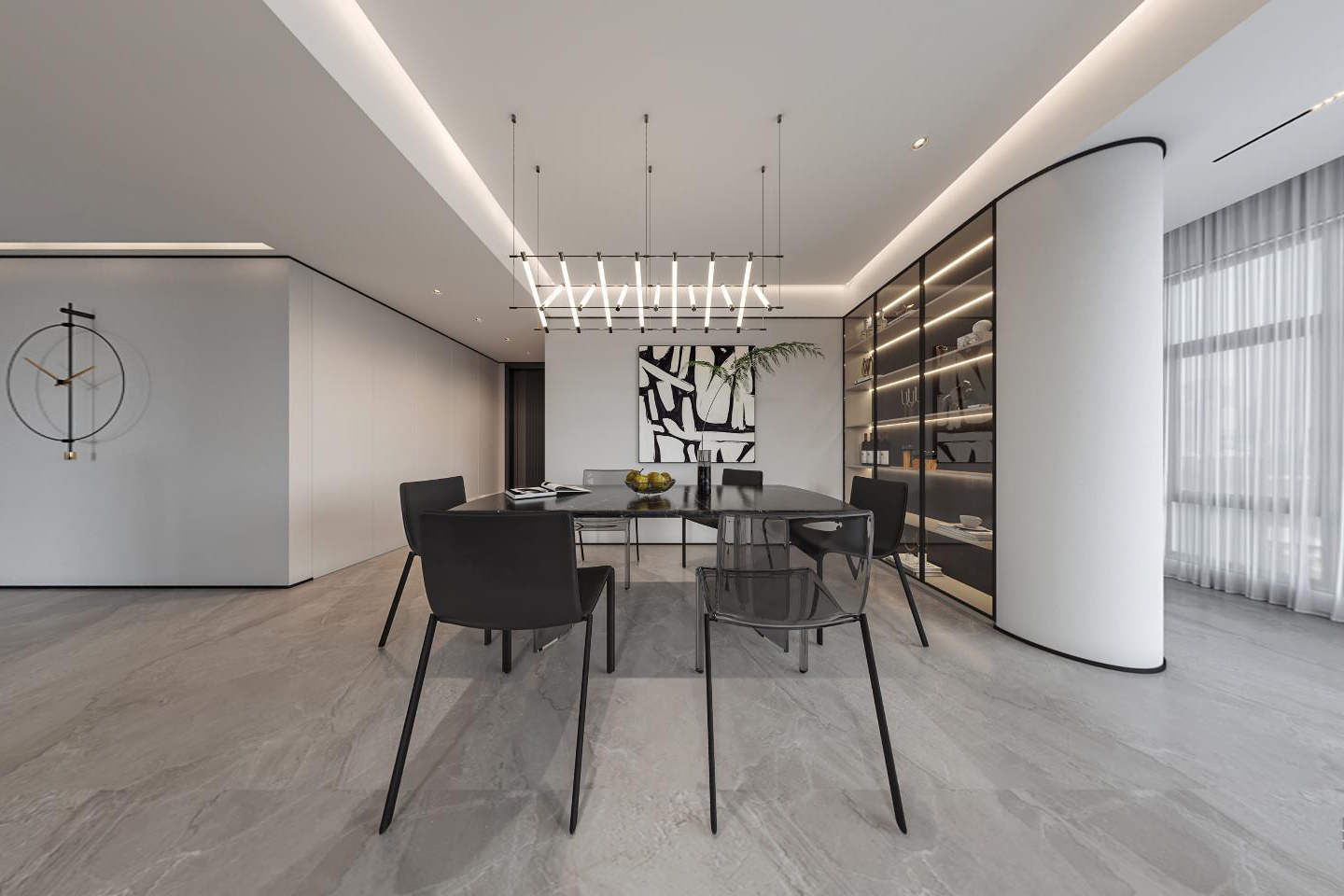 以線條裝飾打造的墻面簡約而又不失沉穩(wěn)高級感,圓形巨型吊頂則營造品質(zhì)格調(diào)感。