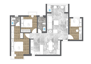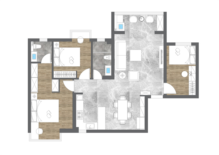 江山如畫這套120㎡的三居室住宅原始戶型結(jié)構(gòu)已經(jīng)進(jìn)行了基礎(chǔ)的功能分區(qū),不過業(yè)主認(rèn)為原有的功能分區(qū)并不能滿足自己與家人日常起居使用需求,因此設(shè)計師在原有戶型結(jié)構(gòu)基礎(chǔ)上進(jìn)行了一定的調(diào)整,將入戶拐角區(qū)域的小空間改造成次臥,滿足客人起居使用需求。廚房與就餐區(qū)域則設(shè)計在臥室與客廳的銜接空白處,同時通過軟隔斷進(jìn)行空間分隔,以提升空間的利用率。