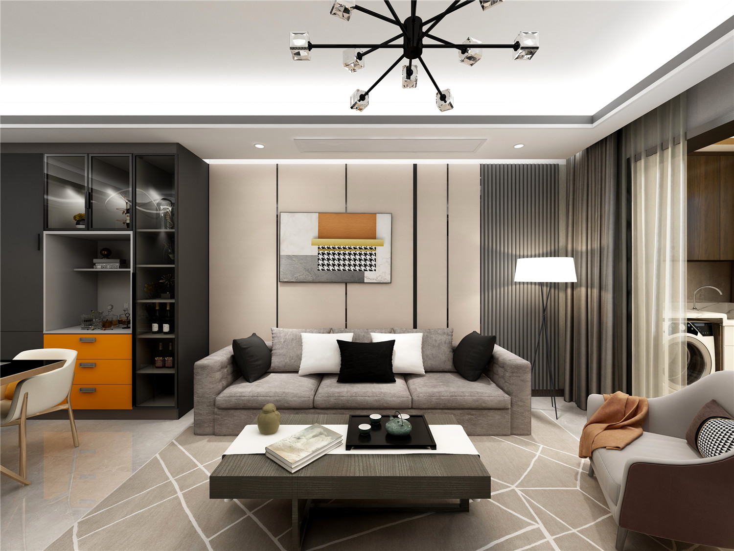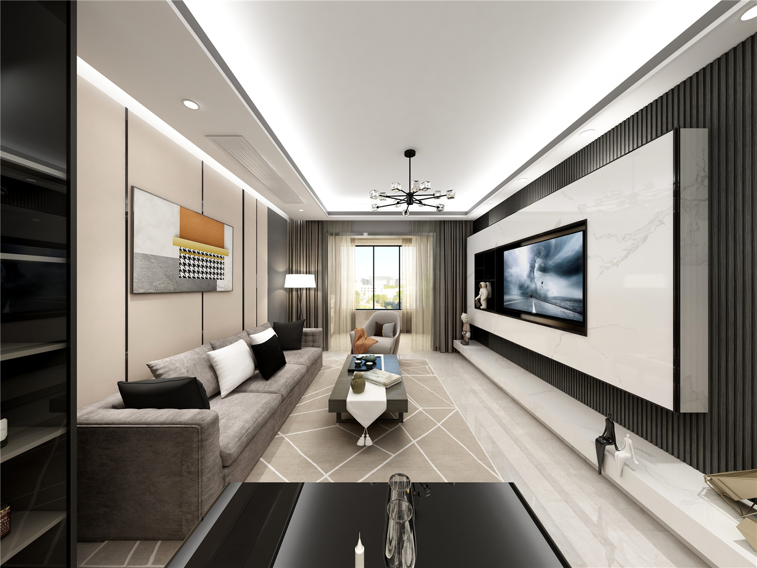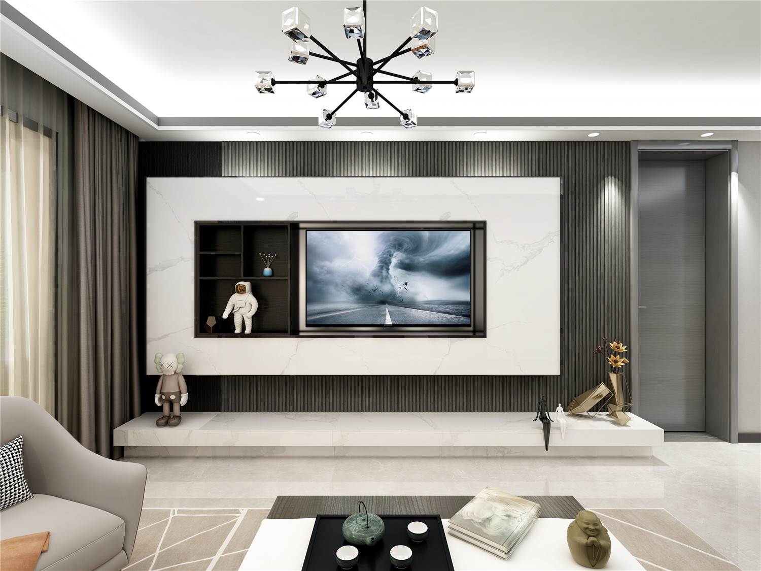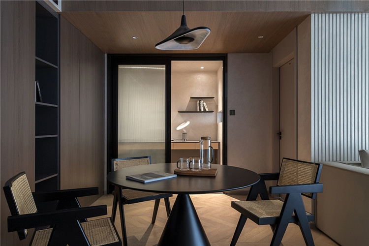 借用隱形門作為電視背景墻,藝術(shù)感十足而又有效提升了藝術(shù)墻面的利用度。