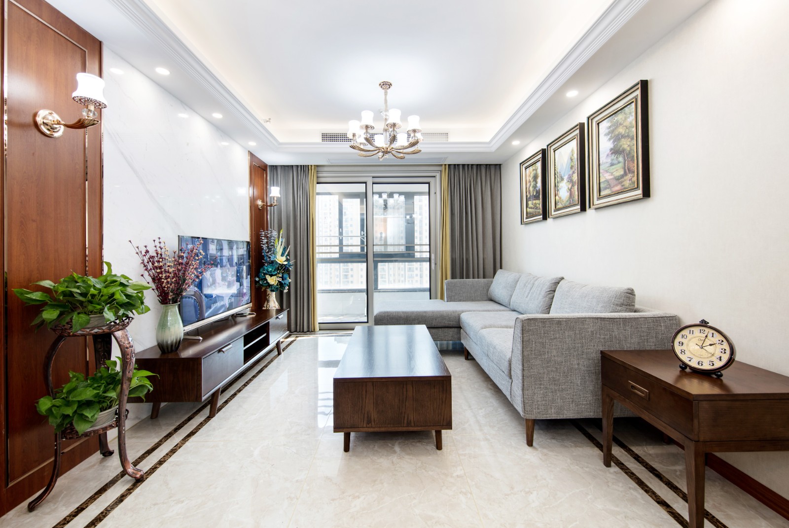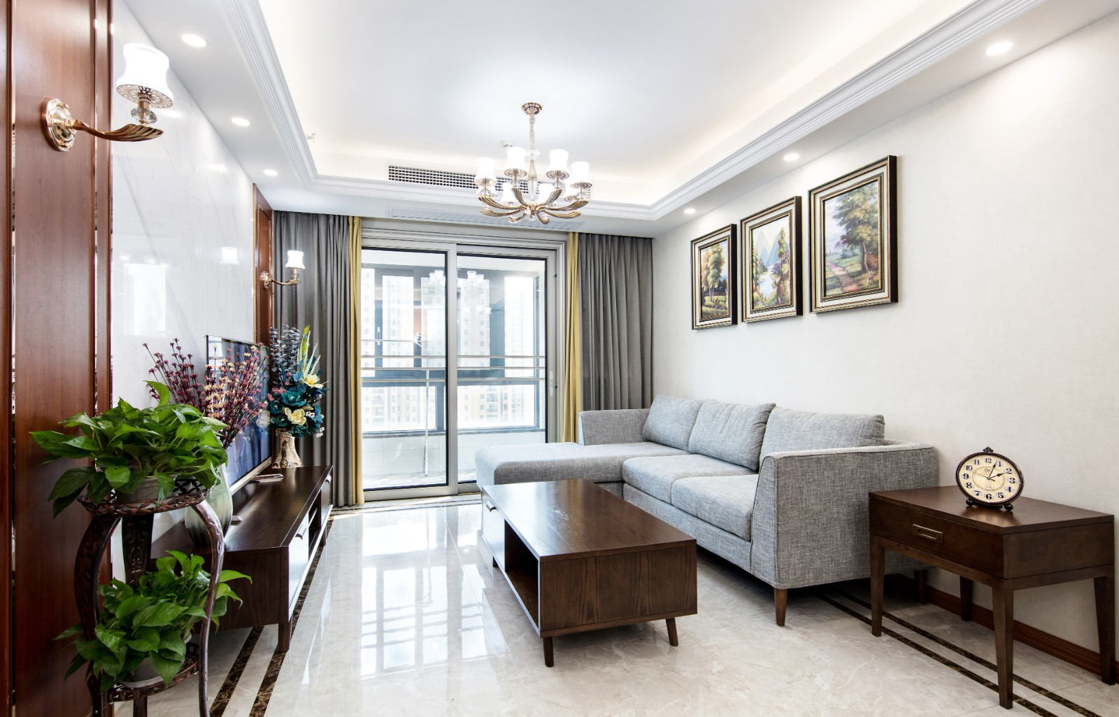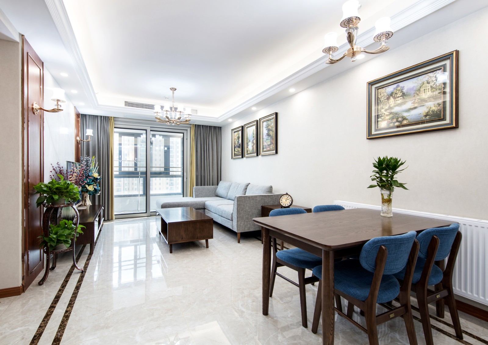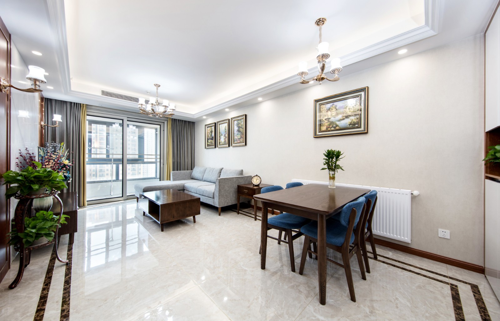 融創(chuàng)瀾岸的這套105㎡的三居室主宰整體的戶型結(jié)構(gòu)相對(duì)比較平整,幾乎沒(méi)有太大的格局缺陷,因此空間設(shè)計(jì)難度不大。為了提升空間的實(shí)密度與美觀度,設(shè)計(jì)師將玄關(guān)處設(shè)置了一定的遮擋,避免室內(nèi)景象直接映入來(lái)者眼前。同時(shí),利用大面積落地窗設(shè)計(jì),將室外的好風(fēng)光進(jìn)入室內(nèi),起到較好的室內(nèi)裝飾點(diǎn)綴效果。