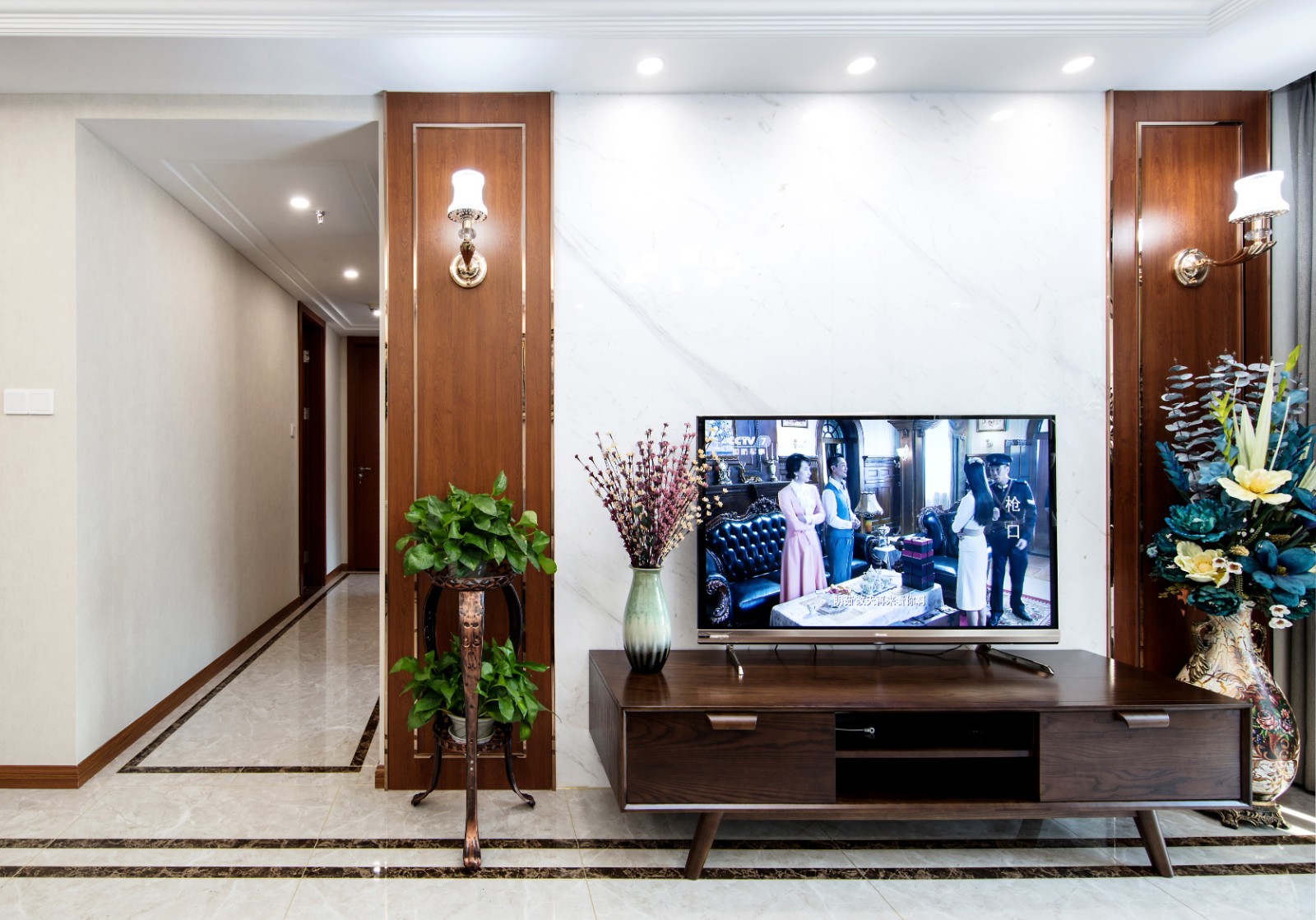 大理石打造的電視背景墻清新而又不失高貴感,搭配上對(duì)稱式木質(zhì)結(jié)構(gòu),平添一抹溫厚柔和之美。