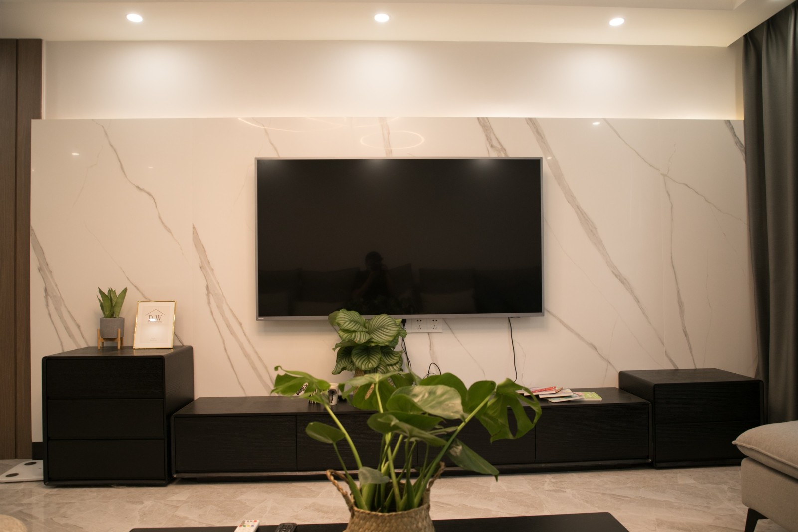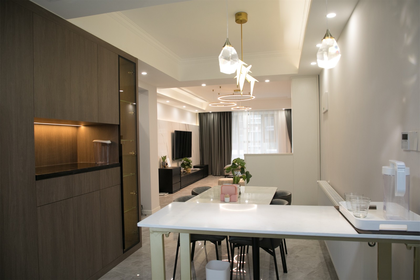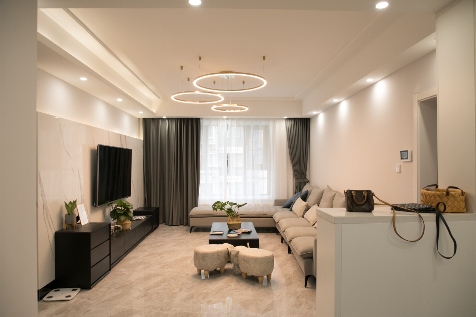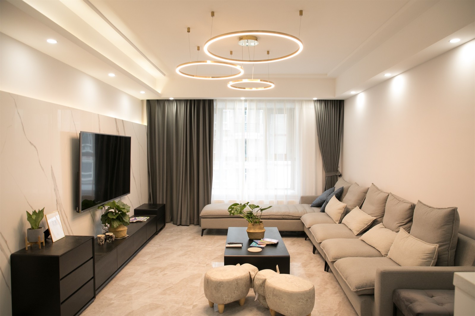 客廳區(qū)域以灰色為主基調(diào)色,點綴以少量黑色,簡約耐看而又時尚。圓形吊燈簡約而又不失設(shè)計感,為空間增添藝術(shù)氣息。