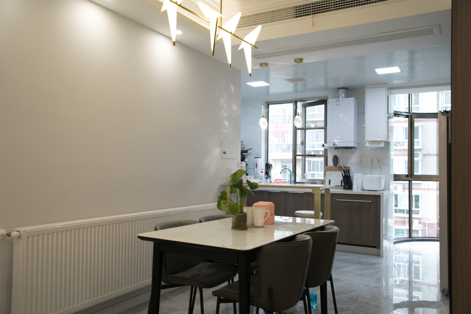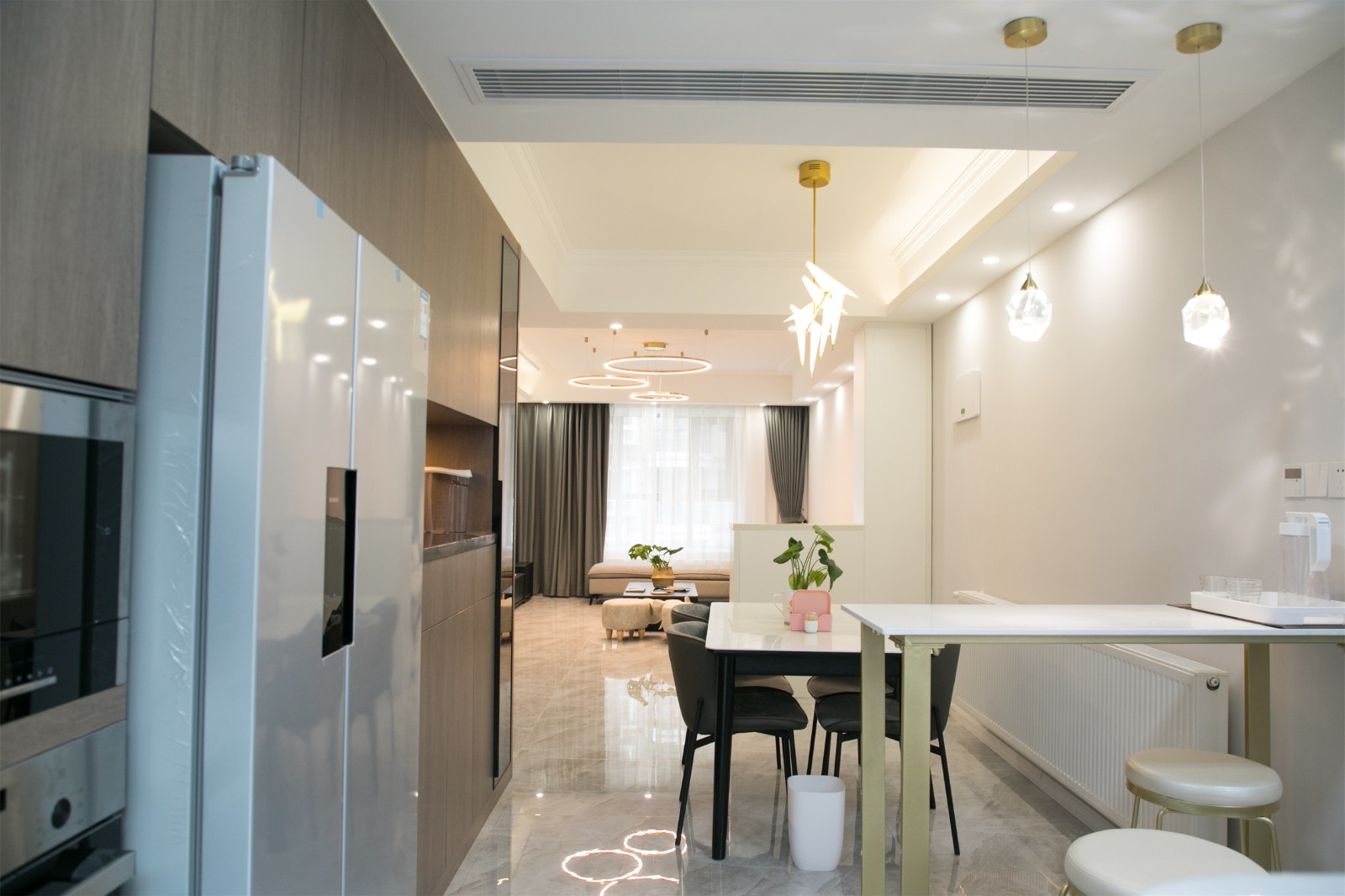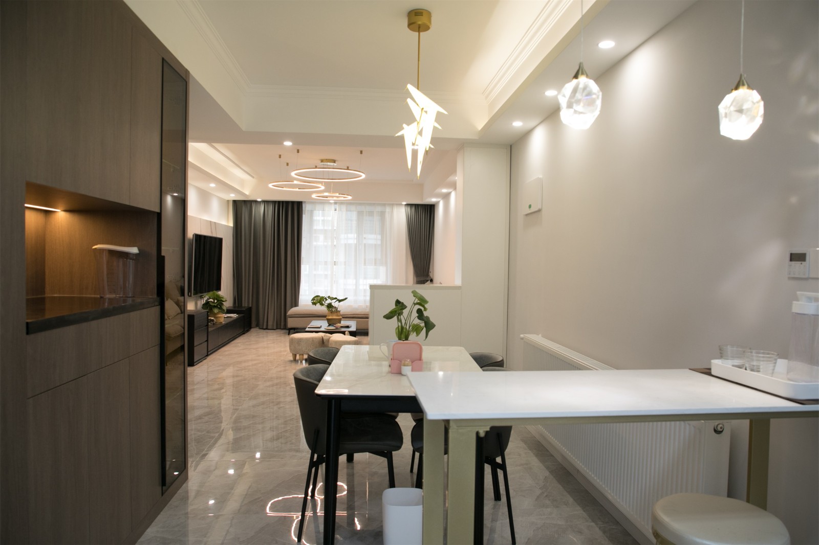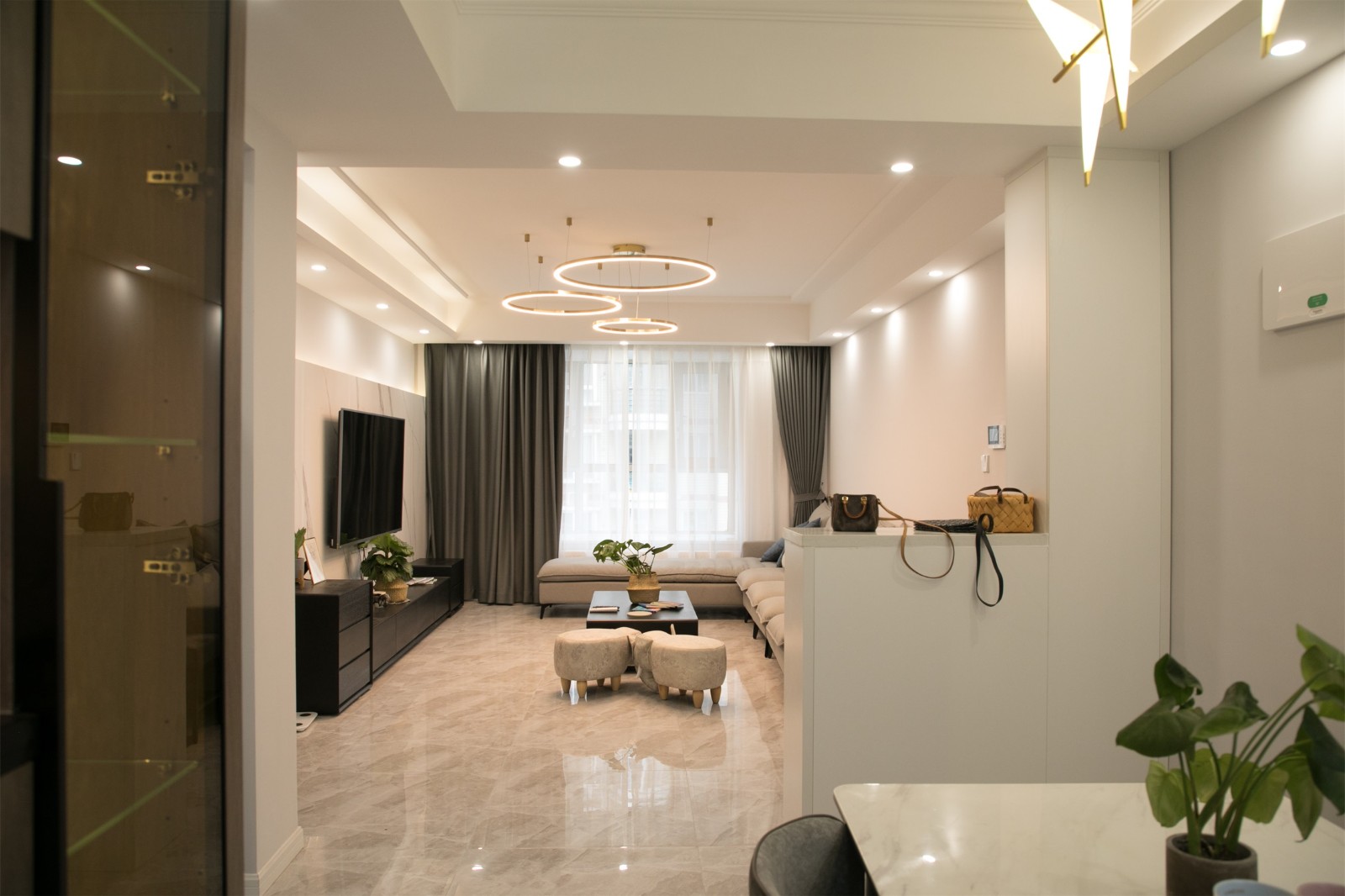 陸景苑的這套138㎡的三居室住宅為朝西戶型,整體的結(jié)構(gòu)四四方方且沒有犄角,最大的問題在于不夠通風(fēng)透氣,且陽光難以進(jìn)入室內(nèi)。因此設(shè)計師在進(jìn)行規(guī)劃設(shè)計的時候,很大程度上保留了原來的戶型功能結(jié)構(gòu),同時將各個功能區(qū)域的窗戶進(jìn)行擴(kuò)大處理,有的直接改造為落地窗,以提升室內(nèi)采光、通風(fēng)效果。
