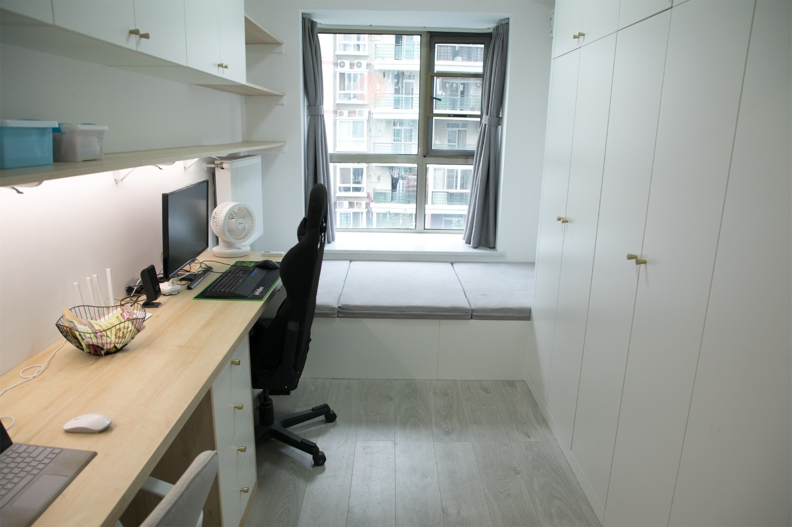 為提升空間利用率,書房空間選用了大量收納設(shè)計。同時,借助大面積的窗戶引進(jìn)自然光,提升書房使用舒適度。