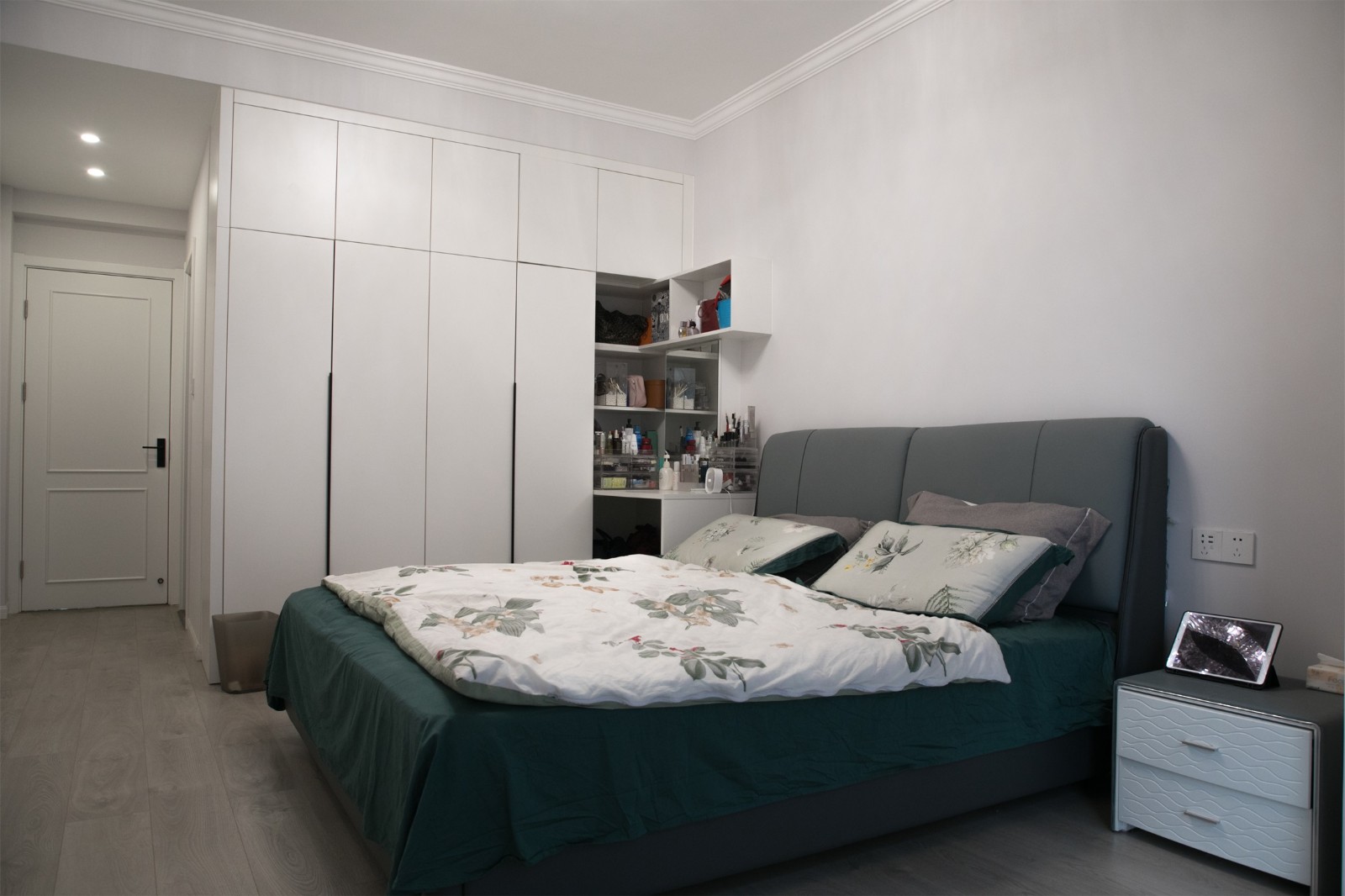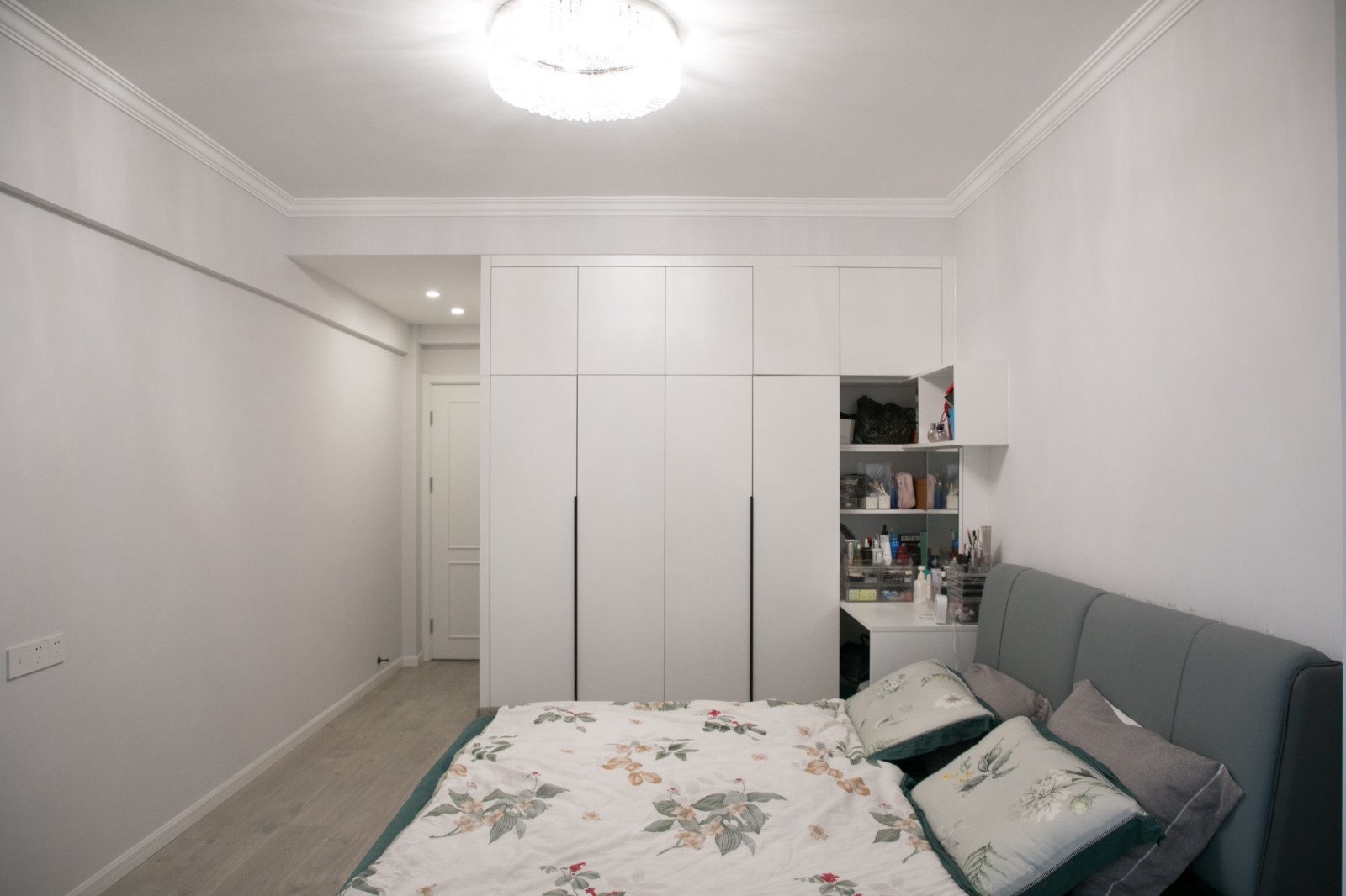 簡約的白色點綴上深色床具,質(zhì)樸簡約而又不失高級感。與白色墻面融為一體的衣柜實用性強(qiáng)且不會過于突兀。
