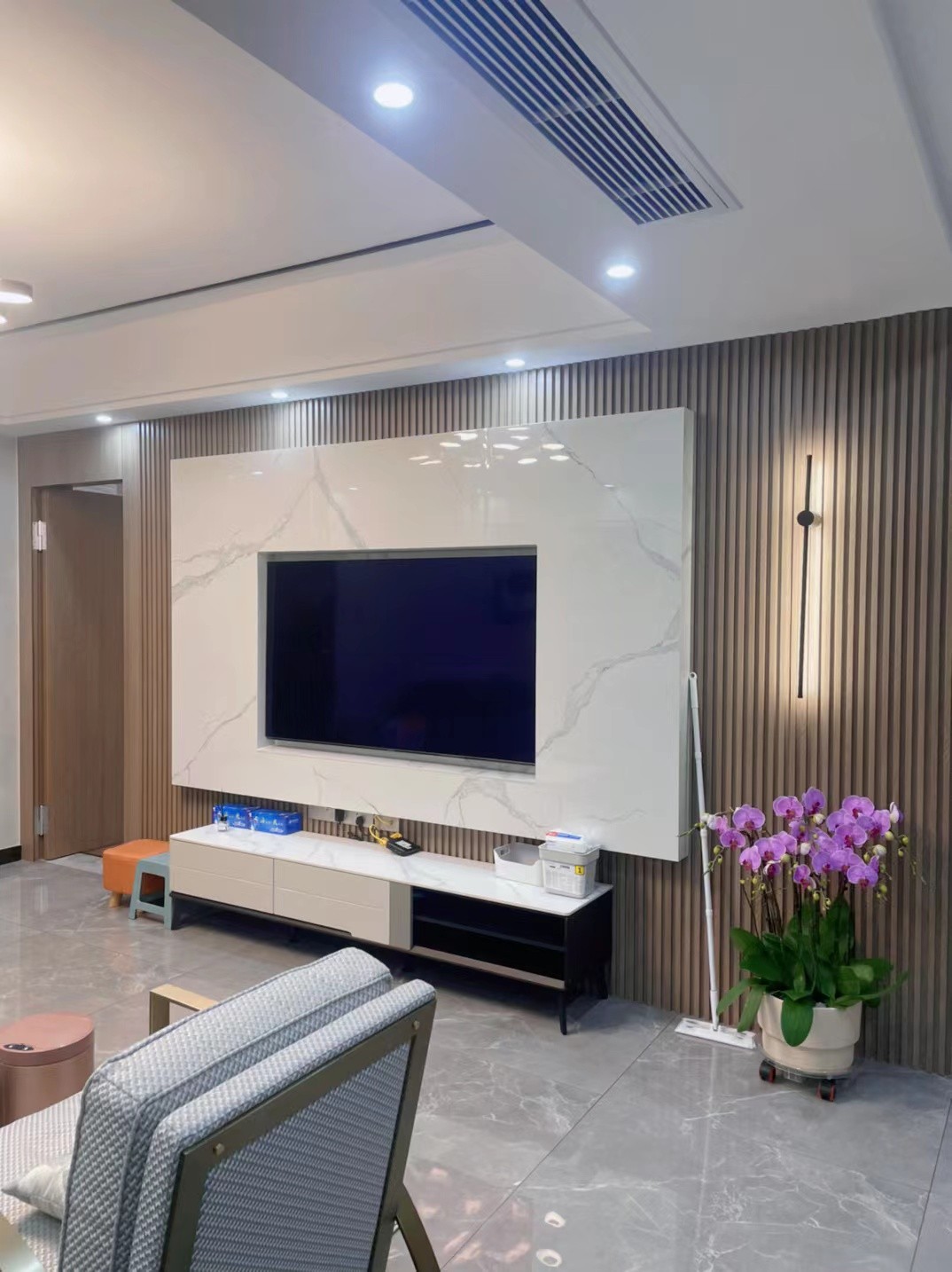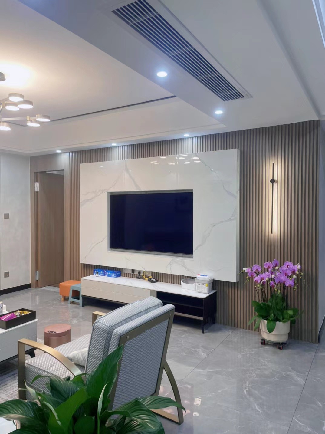 由木質(zhì)與大理石材質(zhì)打造的電視背景墻清新而又不失理性,鏤空的設(shè)計則讓空間的通透感更加強烈。