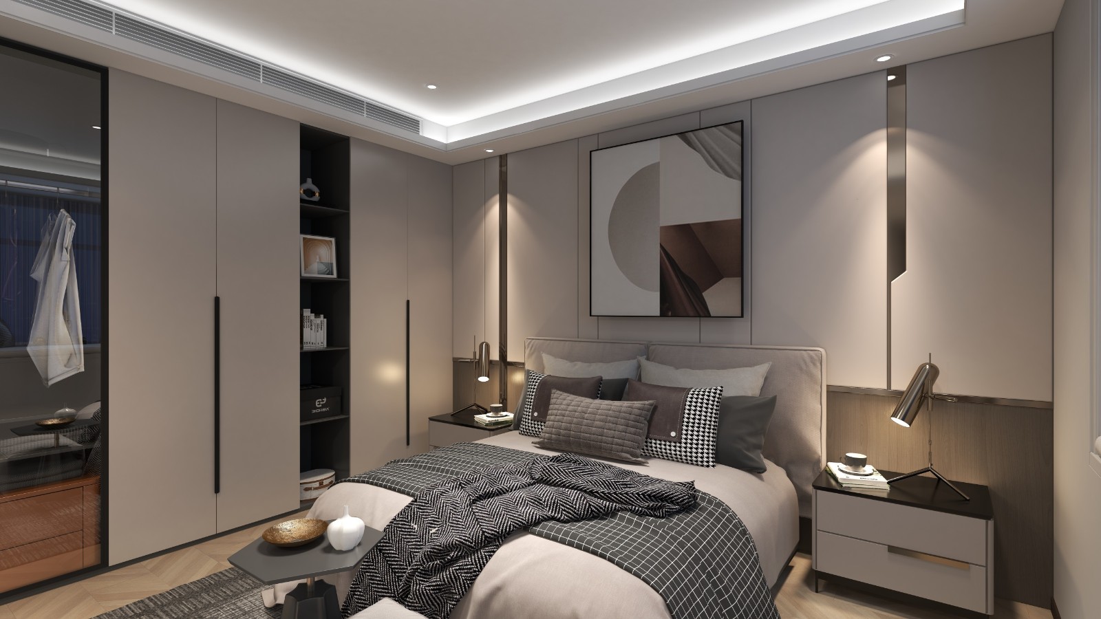 臥室背景墻借用線條抒發(fā)空間簡(jiǎn)約潔凈氛圍,舒適柔軟的床具搭配上簡(jiǎn)潔大方的設(shè)計(jì),讓人在素雅潔凈中更好享受生活的寧?kù)o。